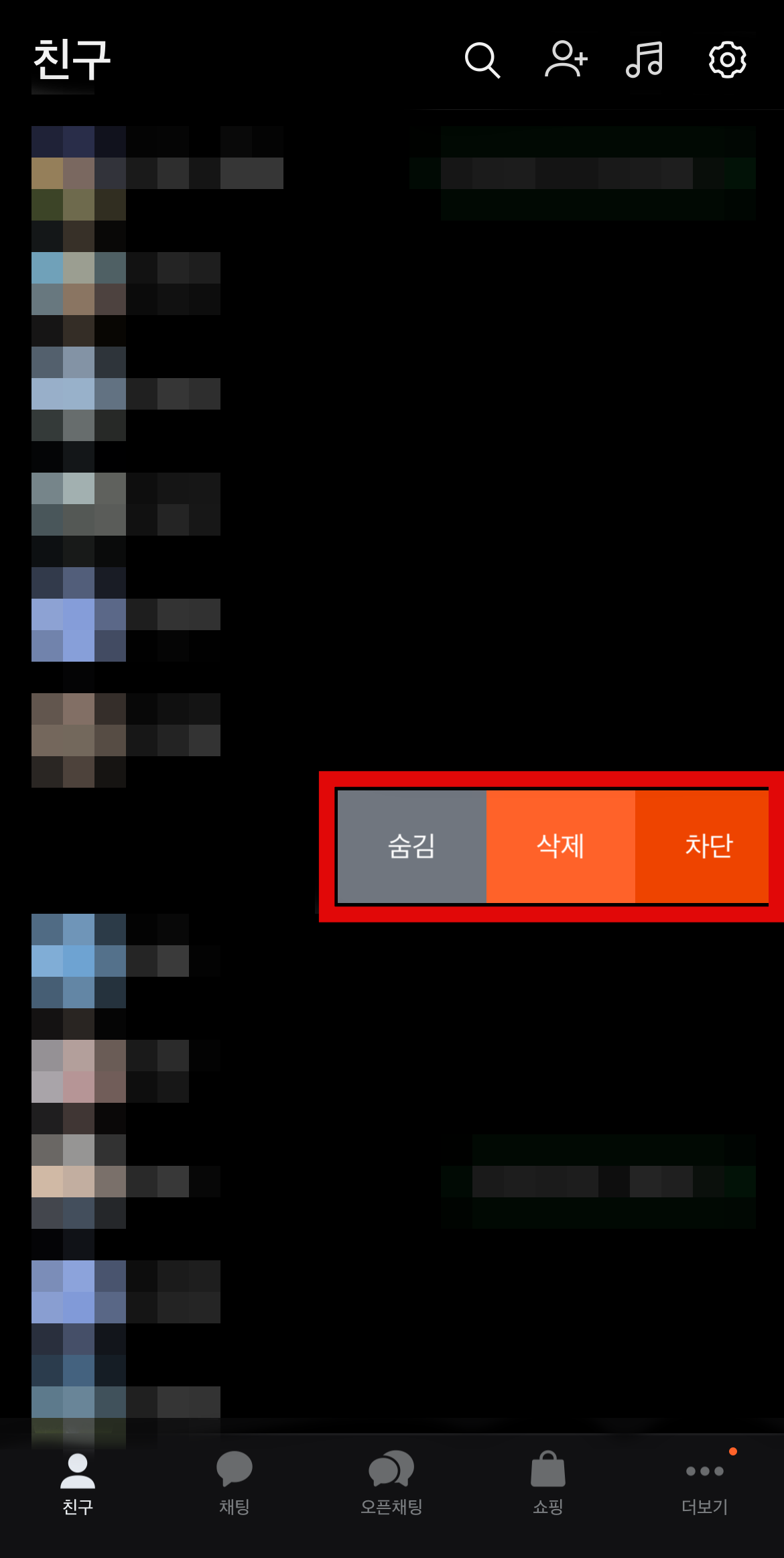 카카오톡 친구 목록에서 삭제를 하고 싶은 친구 프로필을 왼쪽으로 스크롤을 해보자. 그러면 앞서 말한 세 가지를 모두 할 수 있는 숨김, 삭제, 차단이 모두 나올 것이다. 먼저, 숨김기능을 이용하여 카톡 친구 삭제를 해보도록 하자. 숨김을 누르면 친구 목록에서 친구가 사라지며 이 친구는 숨김친구 관리에서 설정이 가능하다.