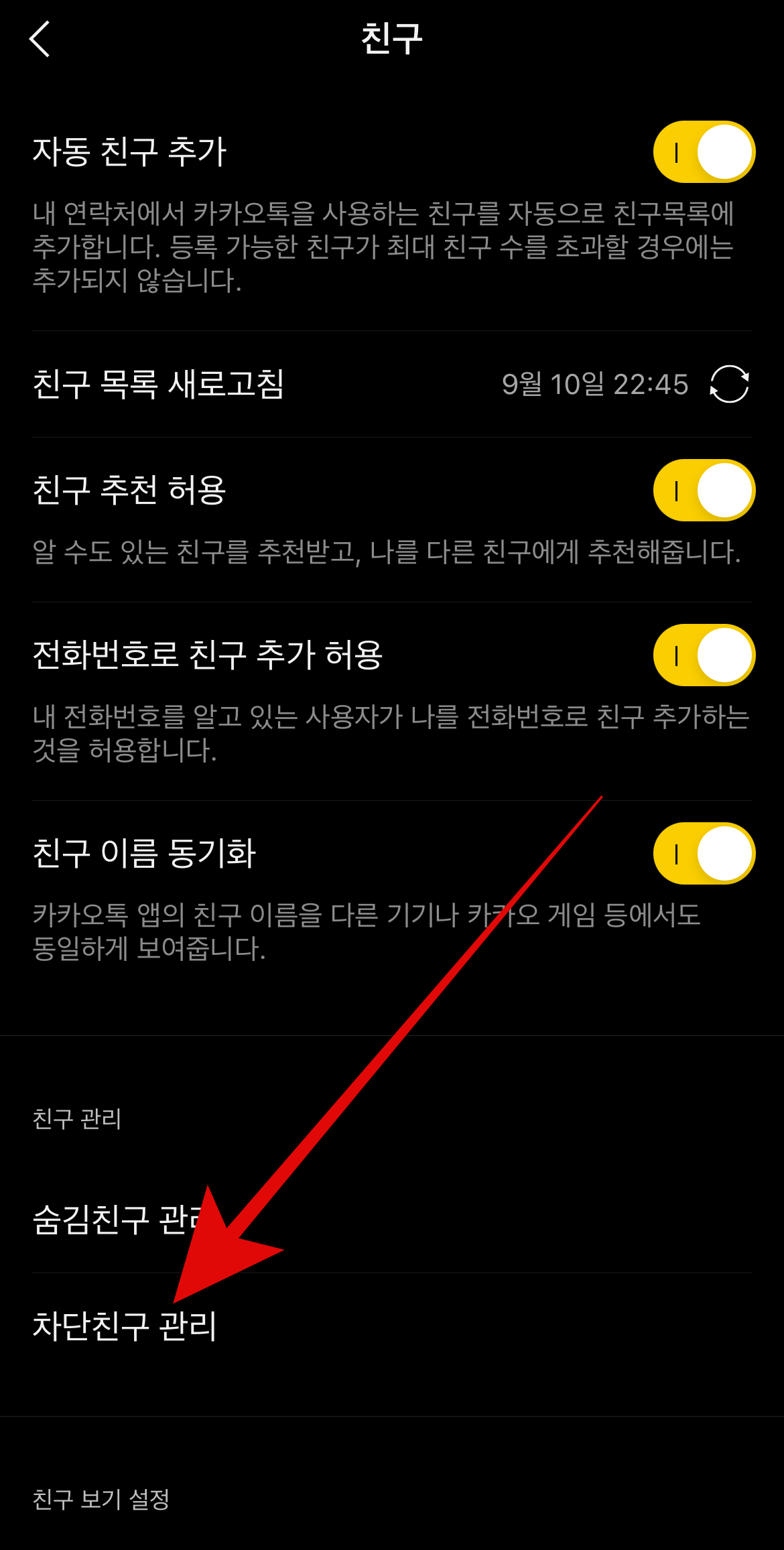 숨김친구 설정은 오른쪽 위에 있는 톱니바퀴 모양을 누르고 친구 관리로 들어간다. 조금 아래쪽에 숨김친구 관리를 눌러준다. 그러면 내가 카톡 친구 숨김 해놓은 사람들이 쭉 나올 텐데 여기서 원하는 사람 오른쪽에 있는 관리를 눌러 친구목록으로 복구시킬지, 차단시킬지, 삭제를 시킬지 선택을 할 수 있다.