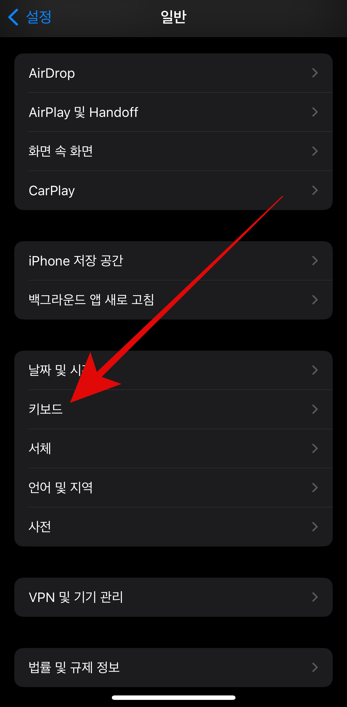 아이폰 천지인 키보드 설정하는 방법은 매우 간단하다. 먼저 아이폰 설정으로 들어가서 일반으로 들어간다. 스크롤을 조금 내리면 키보드가 있을 것인데 키보드로 들어가도록 하자. 여기서 키보드에 관한 설정들을 할 수 있다. 아이폰 키보드 천지인 설정을 하기 위해서는 가장 위에 있는 키보드 탭으로 들어간다.