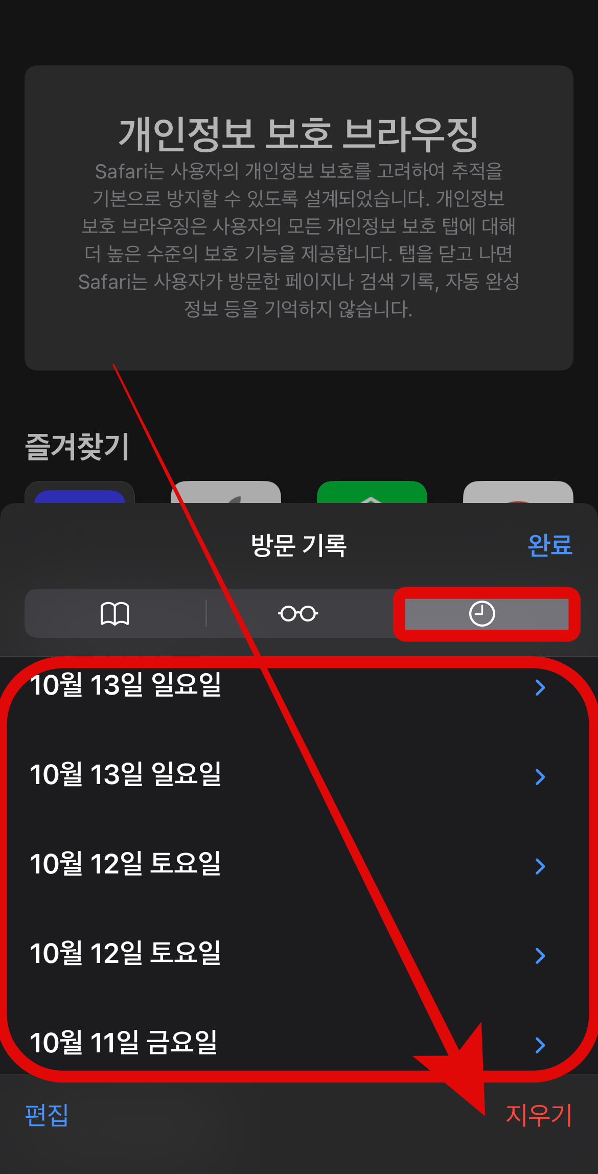 앞서 설명한 아이폰 사파리 방문기록 삭제하는 방법과 같은 화면이 나올 것이다. 여기서도 마찬가지로 내가 삭제하고 싶은 시간 때를 설정하여 지울 수 있다. 시간, 기간 때 별로 통으로 지우지 않고 내가 들어간 특정 사이트만 지우고 싶을 때는 처음 설명한 방법을 통해서만 가능하다. 날짜, 시간을 찾아 삭제를 원하는 방문기록을 왼쪽으로 스와이프를 하면 삭제가 가능하다.