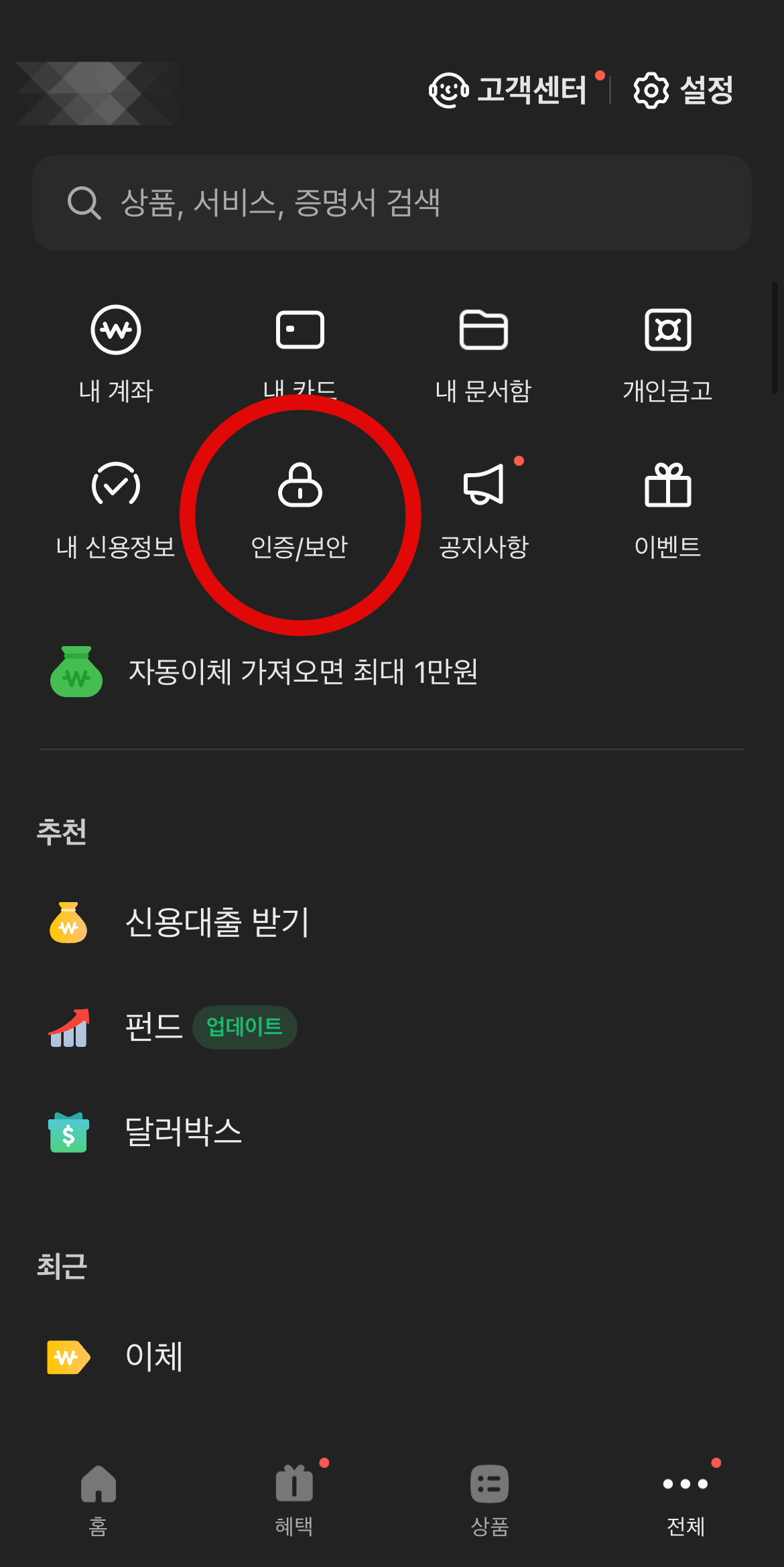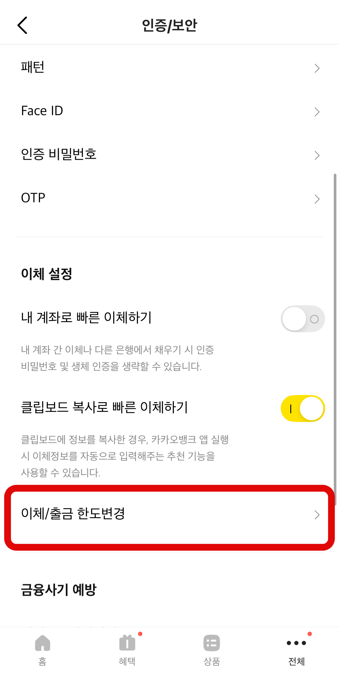 카카오뱅크 이체한도 변경, 조회를 하기 위해서 카카오뱅크로 들어가서 오른쪽 밑에 있는 전체(점 세 개 버튼)를 눌러준다. 그러면 다양한 설정을 할 수 있는 화면으로 바뀌는데 여기서 '이체'가 아닌 '인증/보안'으로 들어간다. 그리고 스크롤을 조금 내리다 보면 이체/출금 한도변경이라는 탭을 찾을 수 있을 것이다.