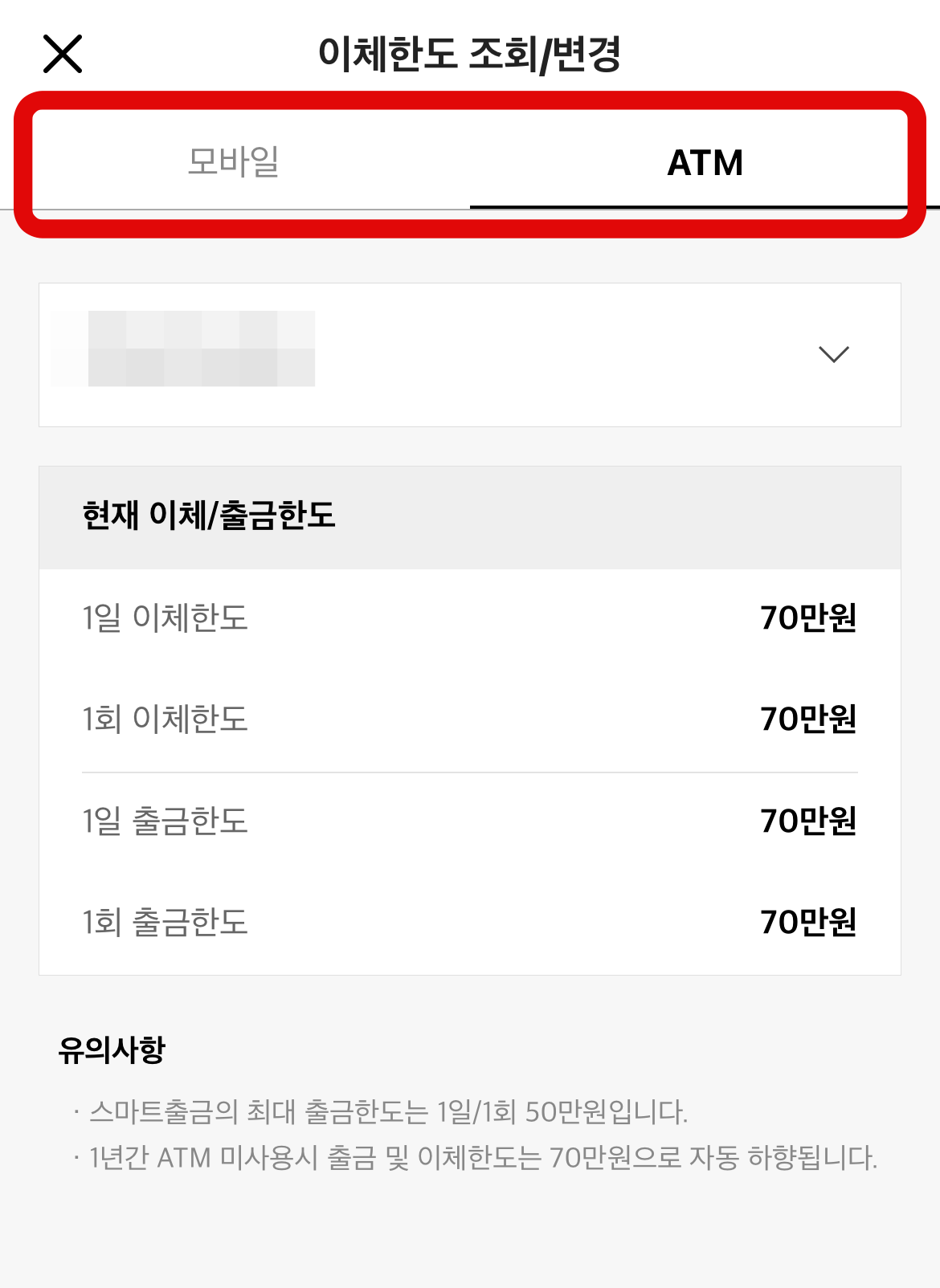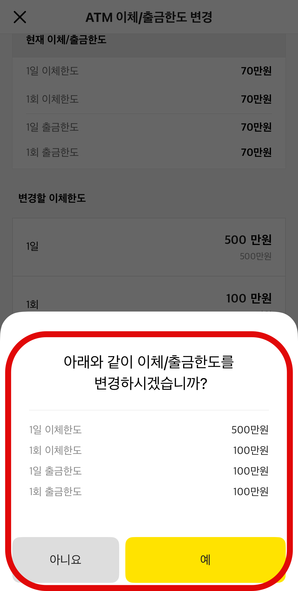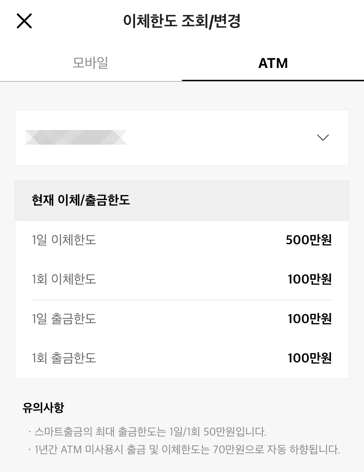 다시 카카오뱅크 이체한도 조회하는 곳으로 들어와보면 아까는 70만 원이었던 이체한도가 500만 원, 100만 원으로 변경된 것을 확인할 수 있을 것이다. ATM기 이체한도를 변경한 사람은 주의해야 할 점이 있다. 1년간 ATM 미사용 시 다시 기본값인 70만 원으로 자동으로 하향된다는 점이다.
