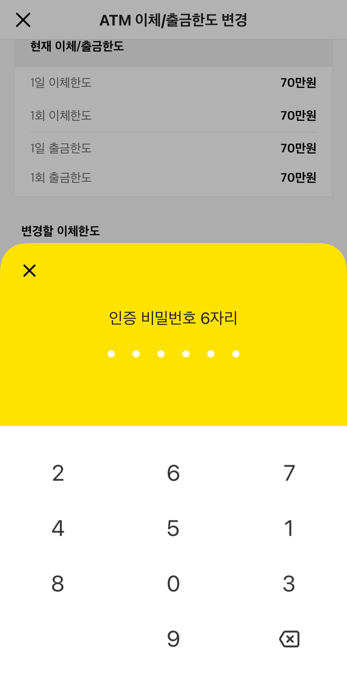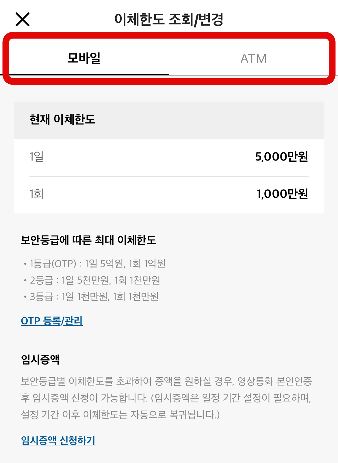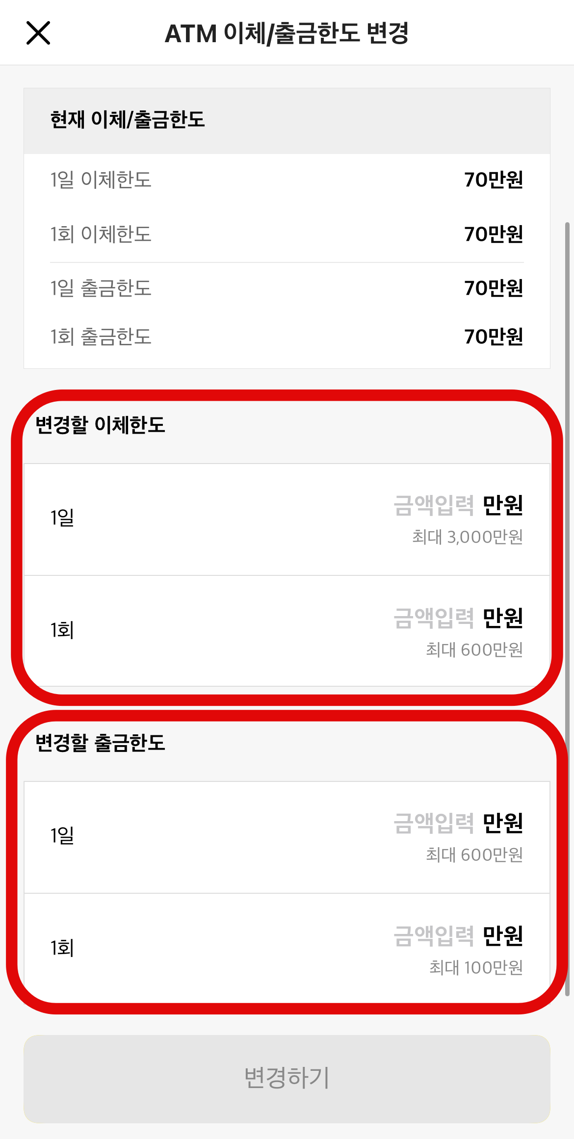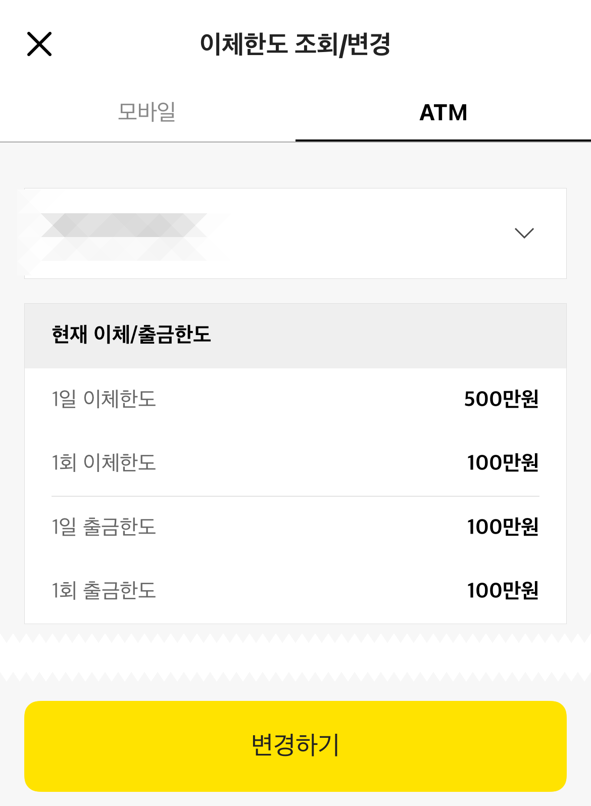카카오뱅크 이체한도 조회도 여기서 바로 할 수 있다. 기본으로 적용되어 있는 이체한도는 모바일에서 1일 5,000만 원, 1회 1,000만 원이며 ATM기에서는 1일, 1회 이체 및 출금 70만 원으로 설정이 되어있다. 여기서 카카오뱅크 이체한도 변경을 원하는 곳에서 하단에 보이는 변경하기를 눌러보자.