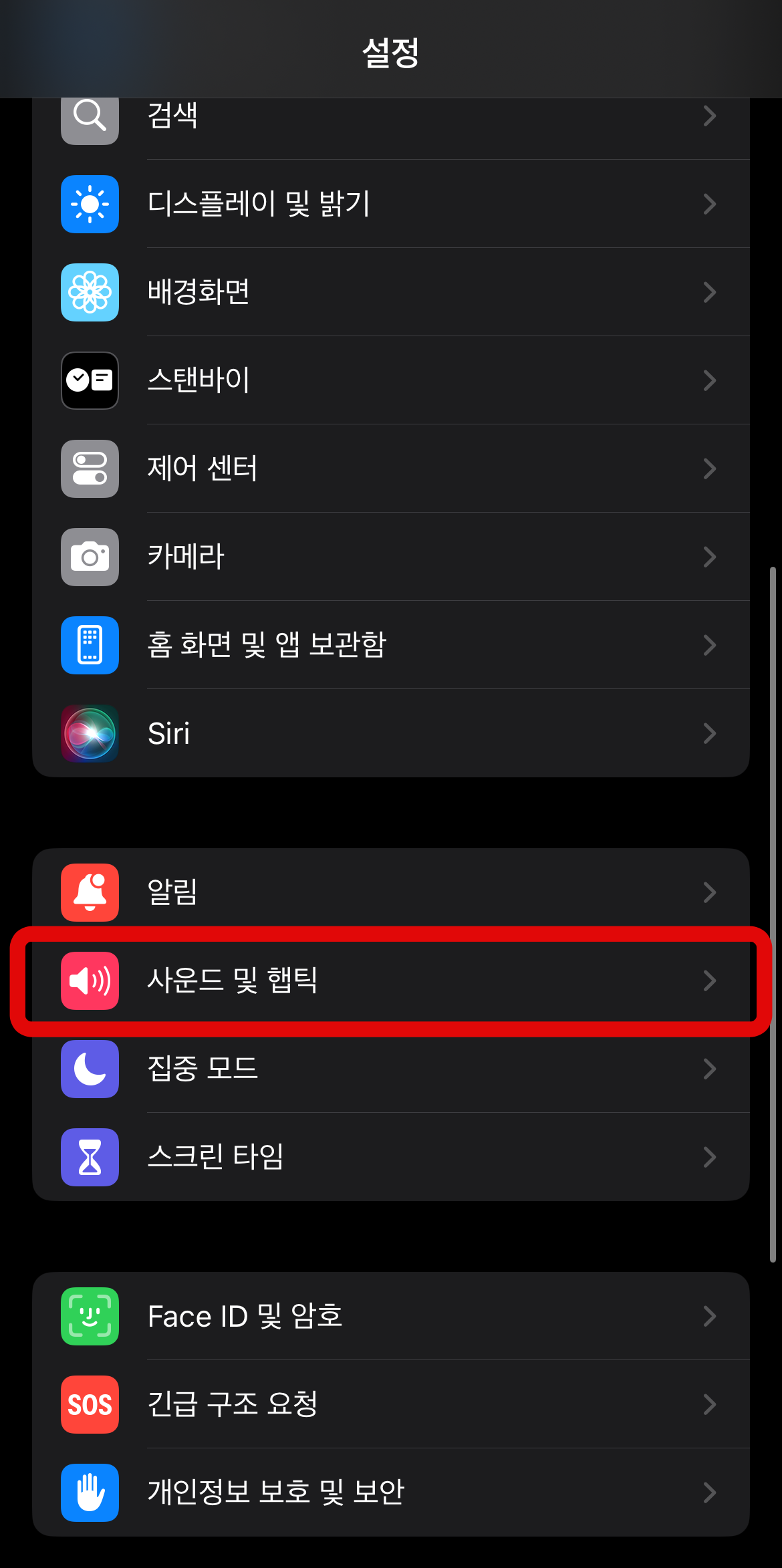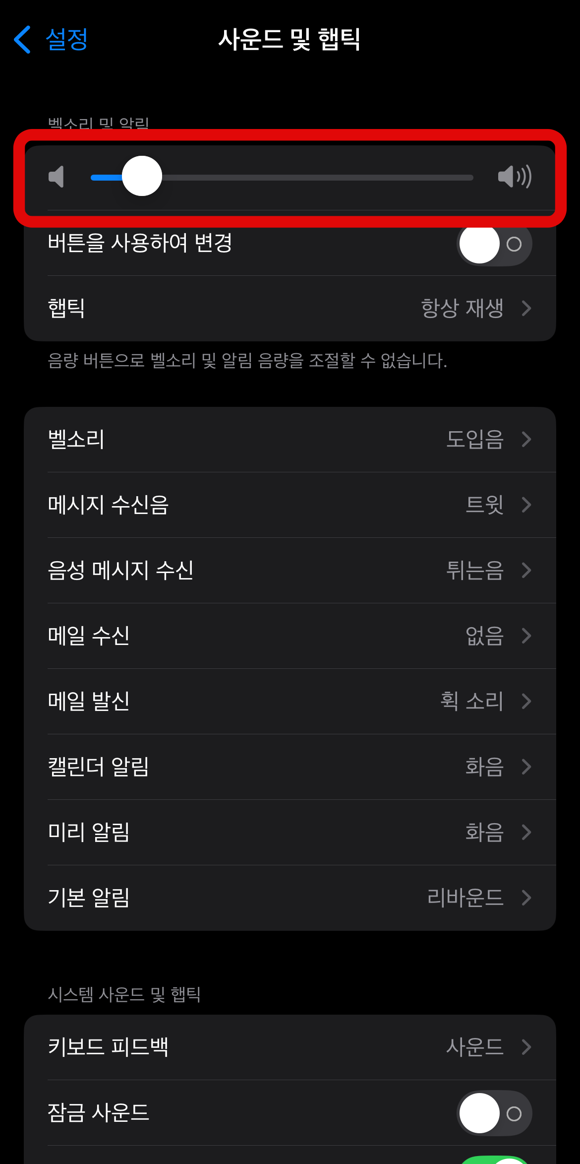 아이폰 알람소리 안 남 현상에서 다음으로 확인해 볼 사항은 휴대폰 벨소리를 꺼놓은지 확인해야 한다. 아이폰은 벨소리 크기가 곧 알람소리 크기라서 벨소리를 줄이면 알람소리 또한 같이 줄어든다. 설정에 들어가서 사운드 및 햅틱으로 들어간다. 여기서 가장 위에 있는 벨소리가 꺼져있는지 확인해 볼 필요가 있다. 아이폰 알람소리 크기 조절도 여기서 벨소리를 올려야 알람소리가 커진다.