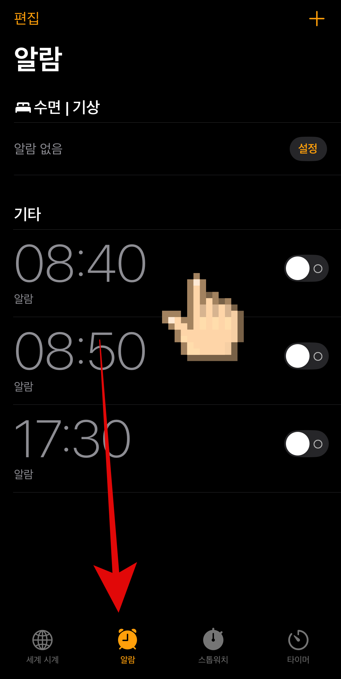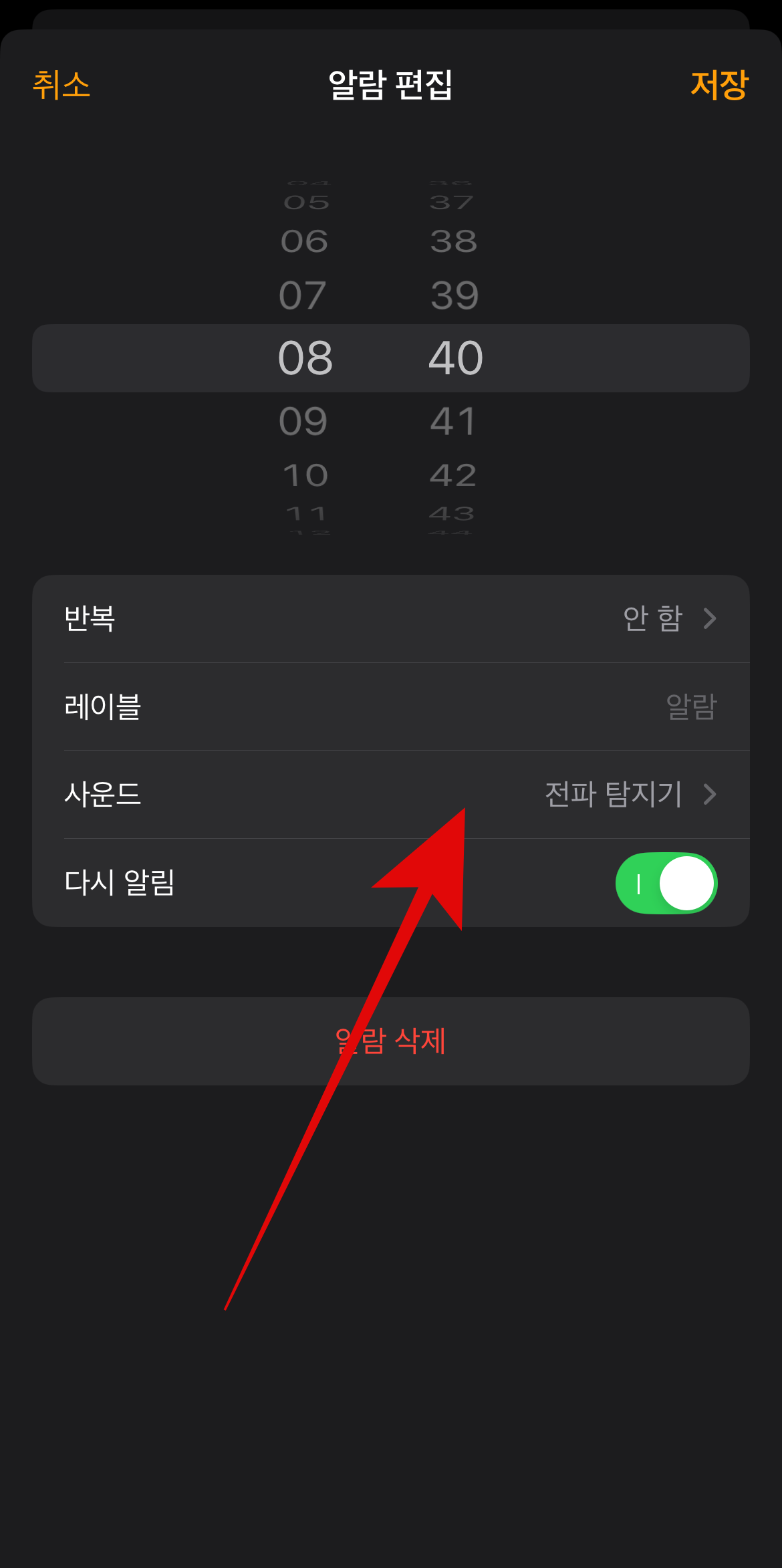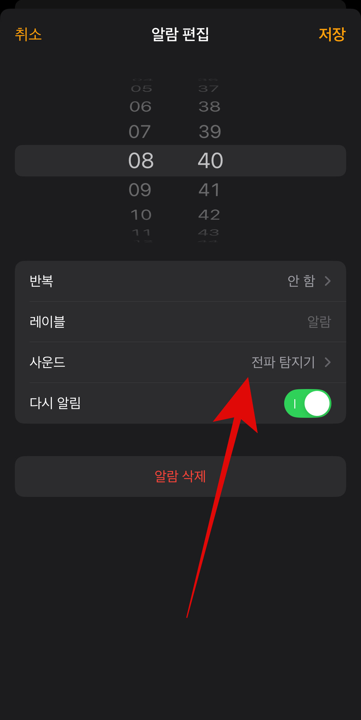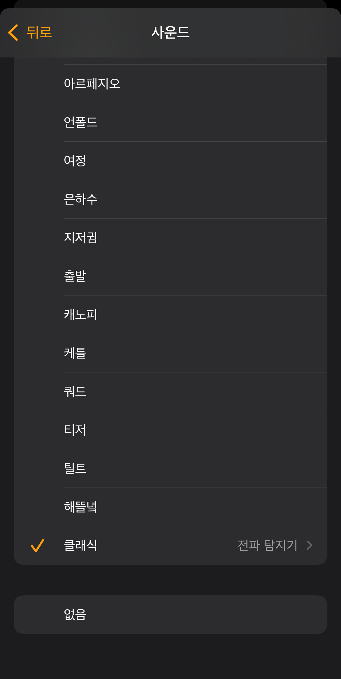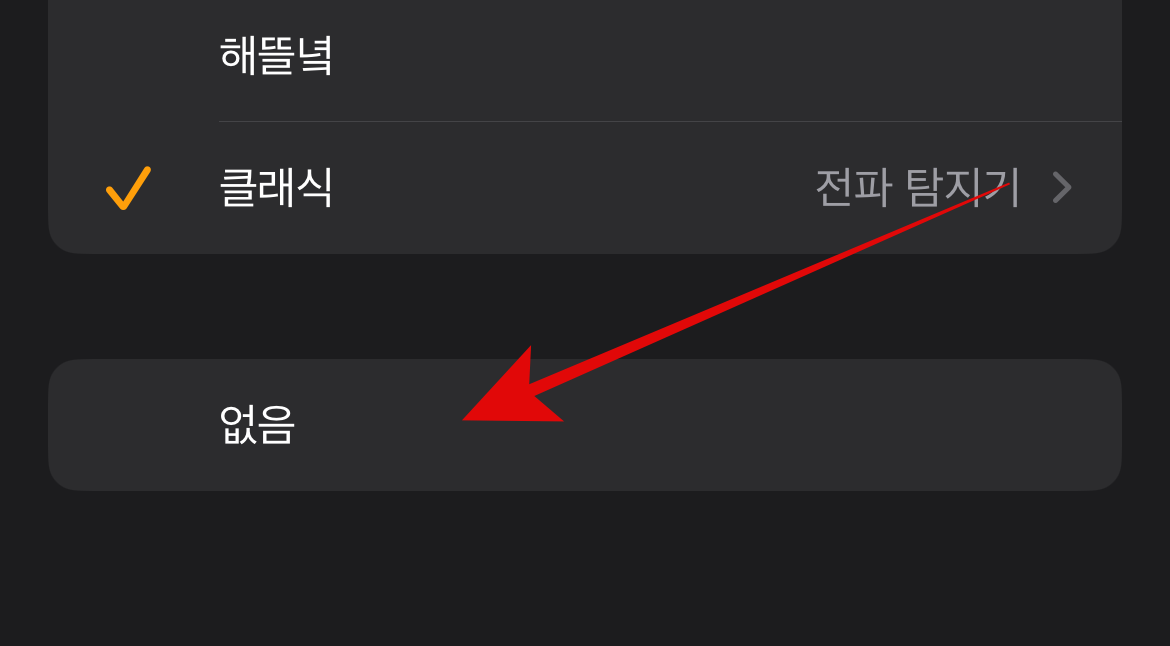 아이폰 알람소리 안 남 현상이 있을 때 가장 기본적으로 확인해 볼 수 있는 것은 내가 설정해 놓은 알람이 무음으로 설정되어 있는지 확인하는 방법이다. 다른 어떤 알람음이 아닌 가장 하단에 없음에 체크가 되어있는지 확인해 볼 필요가 있다. 알람소리 없음이 아니라면 다음 사항을 체크해보도록 하자.