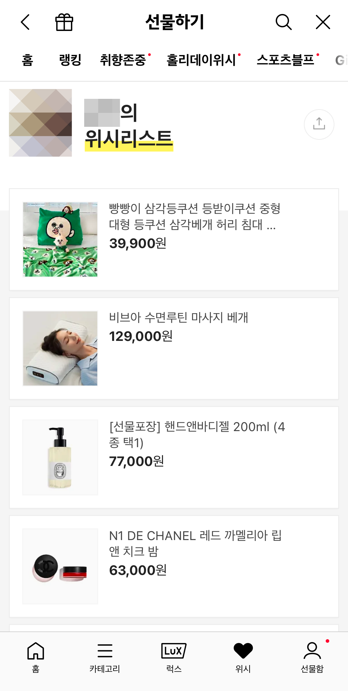 그러면 카카오톡 친구목록이 나올 텐데 여기서 선물을 하려고 하는 상대방을 누르면 카톡 선물하기 친구 위시리스트가 나올 것이다. 여기서 사주고 싶은 선물을 골라 선물을 한다면 받는 사람이 더욱 좋아할 것이다. 하지만 위시리스트를 설정하지 않은 사람은 공개된 받고 싶은 선물이 없다고 나온다.