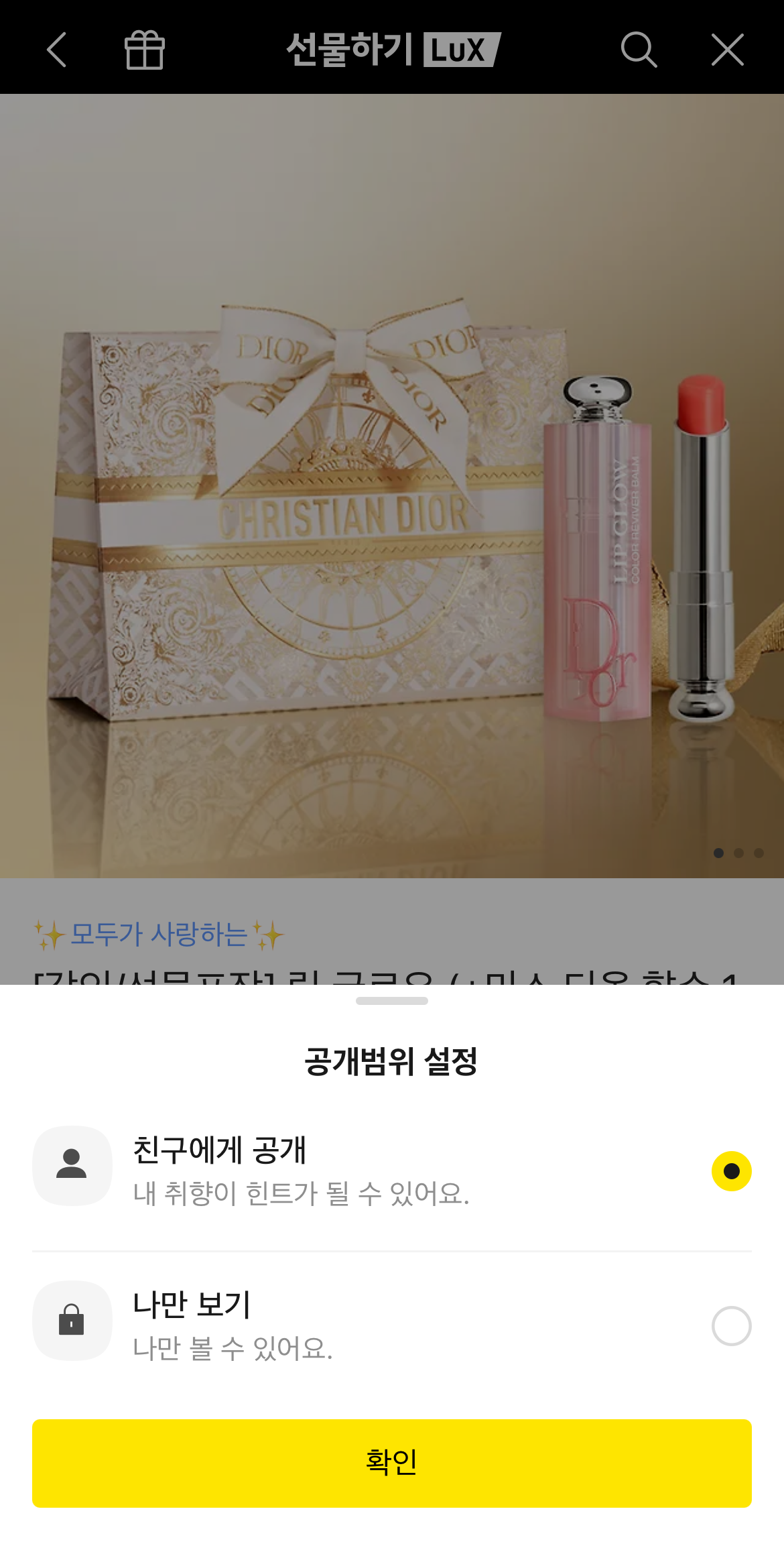 나의 위시리스트를 설정하는 방법을 몰라서 안 해놓은 사람들도 많을 텐데 하는 방법은 간단하다. 카카오톡 선물하기에서 내가 갖고 싶은 선물을 골라 들어가 준다. 여기서 왼쪽 밑에 있는 하트모양을 눌러주면 공개범위를 설정해서 찜목록(위시리스트)에 넣을 수 있다. 친구에게 공개로 설정해서 확인을 하면 내 위시리스트에 들어가서 친구들도 볼 수 있는 상태가 된다. 이렇게 카톡 선물하기 위시리스트를 이용하여 원하는 선물을 받고 상대방에게 원하는 선물을 줄 수 있게 될 것이다.