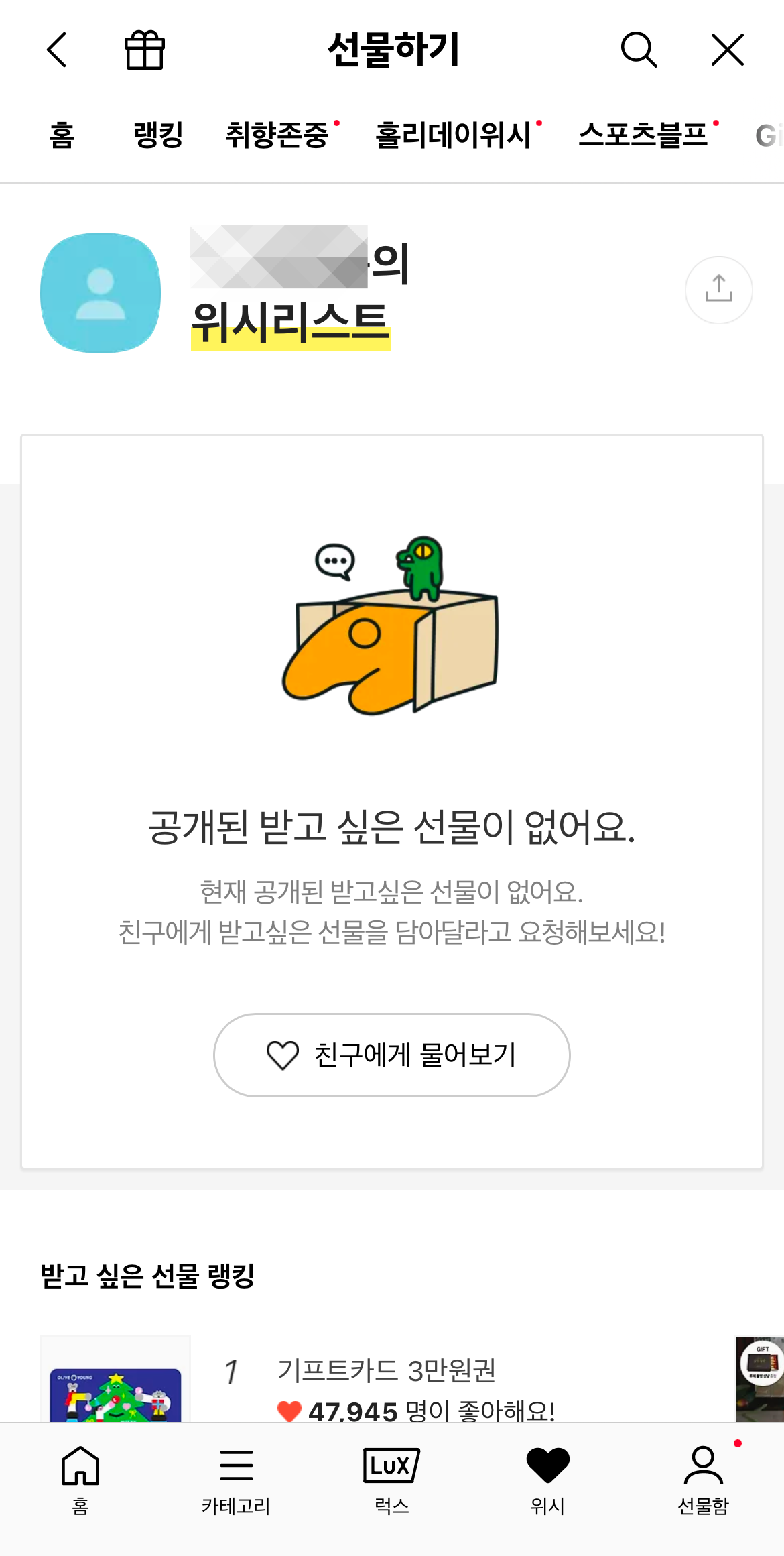 그러면 카카오톡 친구목록이 나올 텐데 여기서 선물을 하려고 하는 상대방을 누르면 카톡 선물하기 친구 위시리스트가 나올 것이다. 여기서 사주고 싶은 선물을 골라 선물을 한다면 받는 사람이 더욱 좋아할 것이다. 하지만 위시리스트를 설정하지 않은 사람은 공개된 받고 싶은 선물이 없다고 나온다.