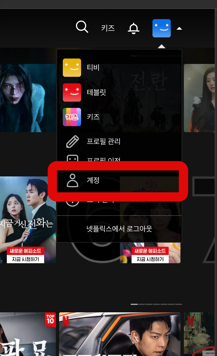 먼저, 컴퓨터로 넷플릭스 언어 변경하는 방법을 알아보도록 하자. 컴퓨터, 노트북으로 넷플릭스 홈에 들어가 준다. 넷플릭스 홈에서 오른쪽 위에 보이는 내 프로필을 눌러보자. 여기서 계정에 들어가면 이 계정에서의 설정을 바꿀 수 있게 된다.