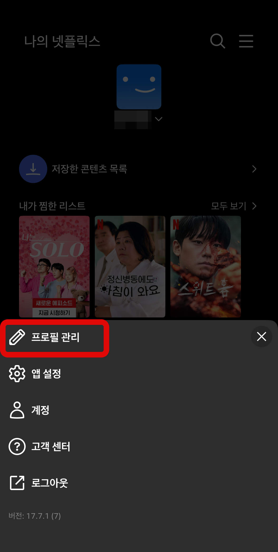 모바일에서 넷플릭스 언어 변경하는 방법은 조금 다른 부분이 있으니 참고하도록 하자. 넷플릭스 어플에 들어가서 오른쪽 밑에 있는 나의 넷플릭스로 들어간다. 그리고 오른쪽 위에 있는 삼선버튼을 누른다. 여기서 컴퓨터와 다르게 '계정'이 아니라 프로필 관리로 들어간다. 넷플릭스 언어 변경을 원하는 프로필을 선택하자.