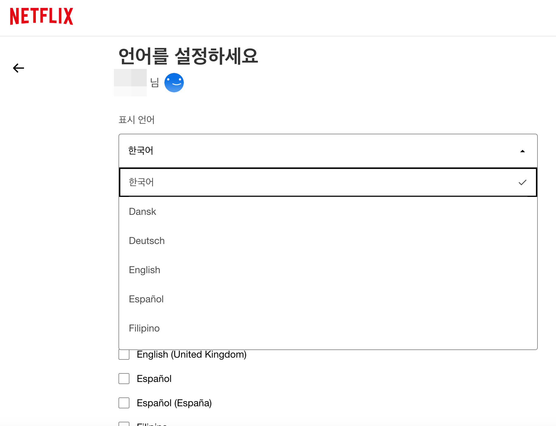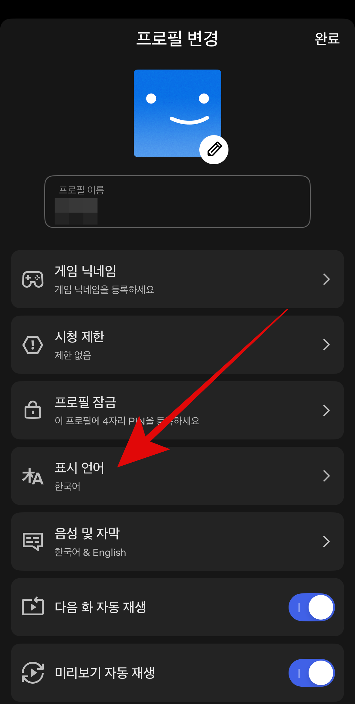 여기서 프로필 이름부터 다양한 설정이 가능하다. 넷플릭스 언어 변경을 위해서는 중간에 있는 표시 언어로 들어간다. 그리고 원하는 언어를 선택하고 완료를 눌러주면 넷플릭스 언어 바뀜 것을 확인할 수 있을 것이다. 컴퓨터나 휴대폰으로 넷플릭스 언어 설정을 해놓았다면 티비나 다른 기기에도 자동으로 언어가 변경될 것이다.