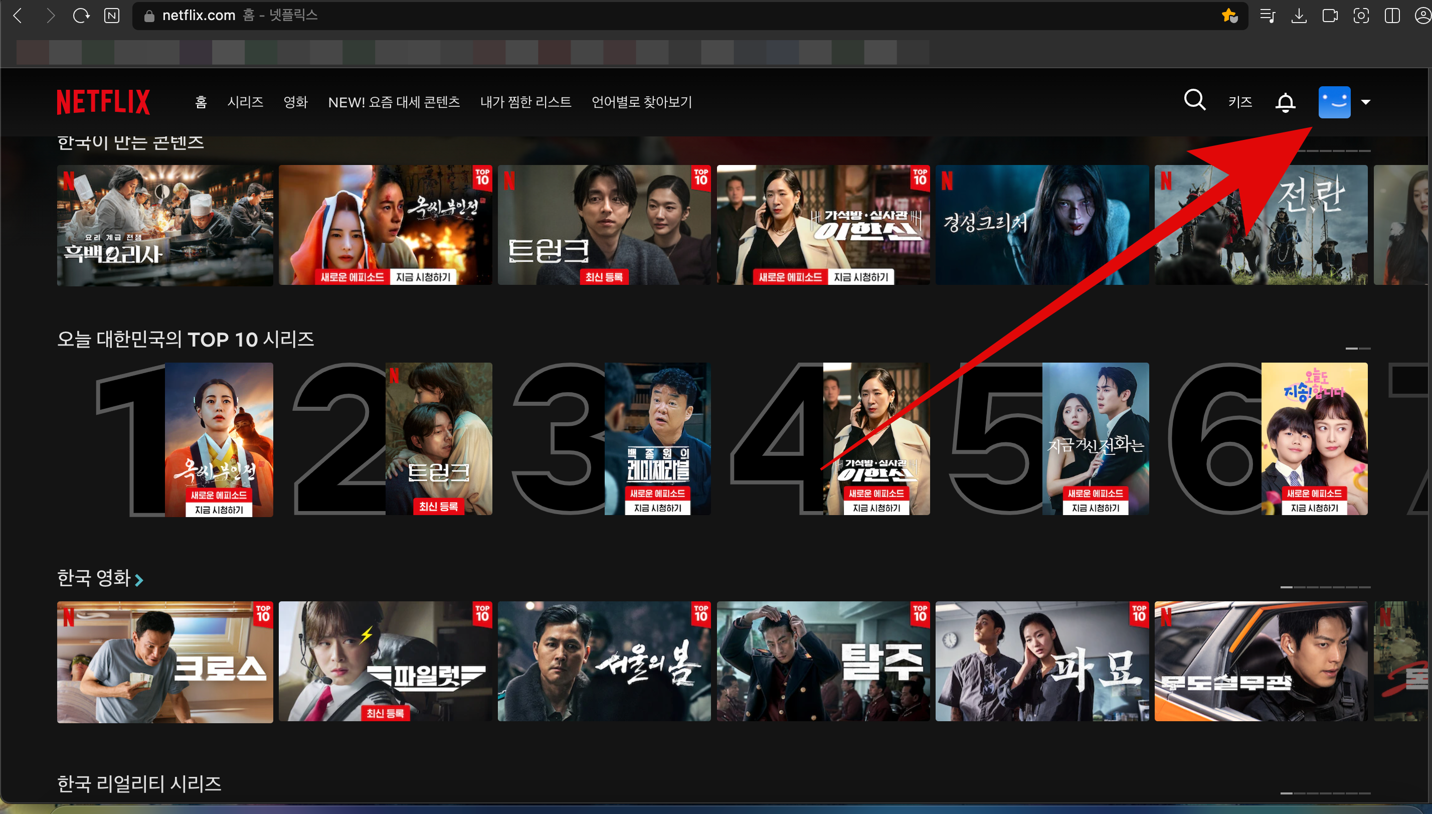먼저, 컴퓨터로 넷플릭스 언어 변경하는 방법을 알아보도록 하자. 컴퓨터, 노트북으로 넷플릭스 홈에 들어가 준다. 넷플릭스 홈에서 오른쪽 위에 보이는 내 프로필을 눌러보자. 여기서 계정에 들어가면 이 계정에서의 설정을 바꿀 수 있게 된다.
