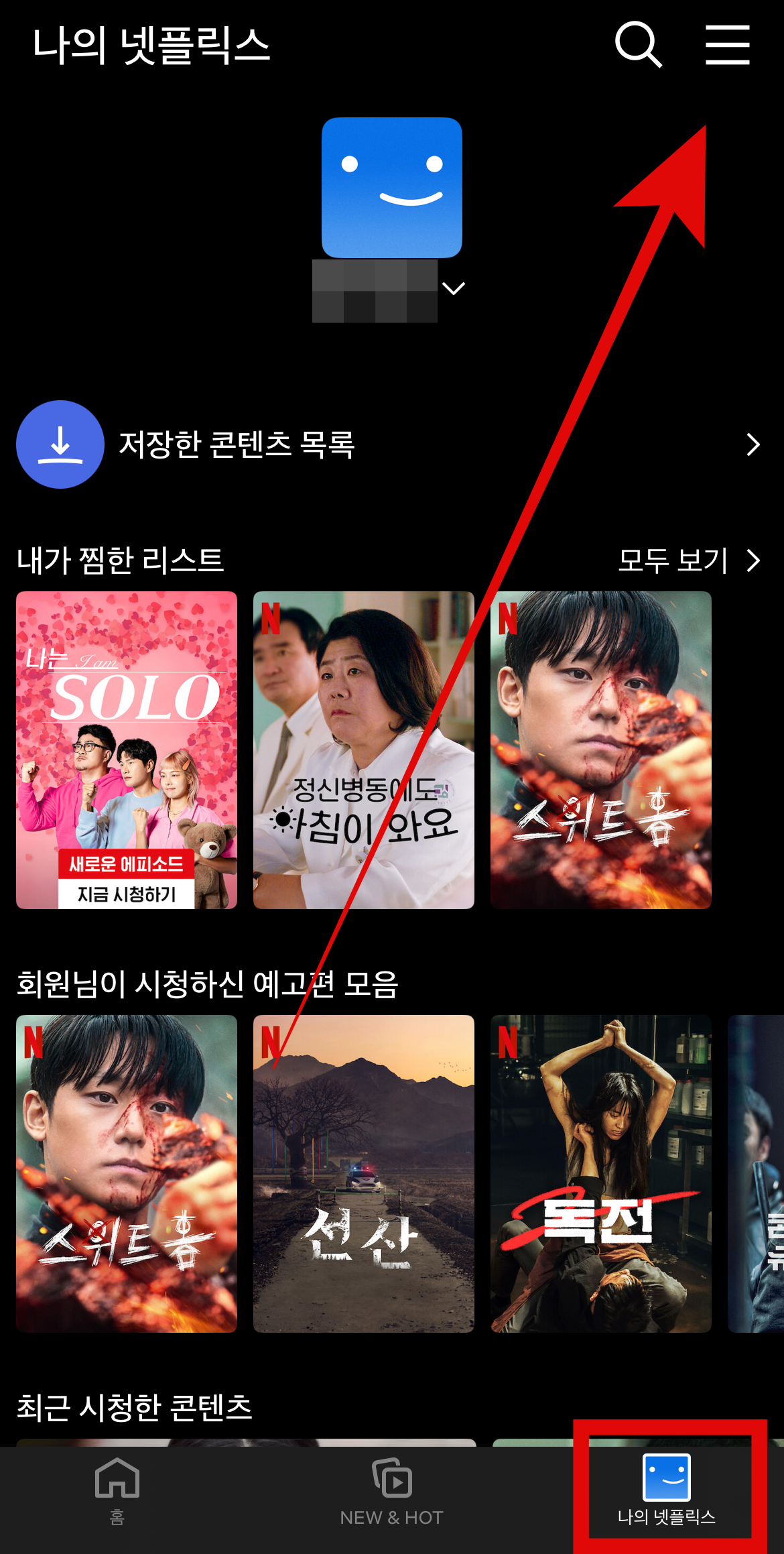 모바일에서 넷플릭스 언어 변경하는 방법은 조금 다른 부분이 있으니 참고하도록 하자. 넷플릭스 어플에 들어가서 오른쪽 밑에 있는 나의 넷플릭스로 들어간다. 그리고 오른쪽 위에 있는 삼선버튼을 누른다. 여기서 컴퓨터와 다르게 '계정'이 아니라 프로필 관리로 들어간다. 넷플릭스 언어 변경을 원하는 프로필을 선택하자.