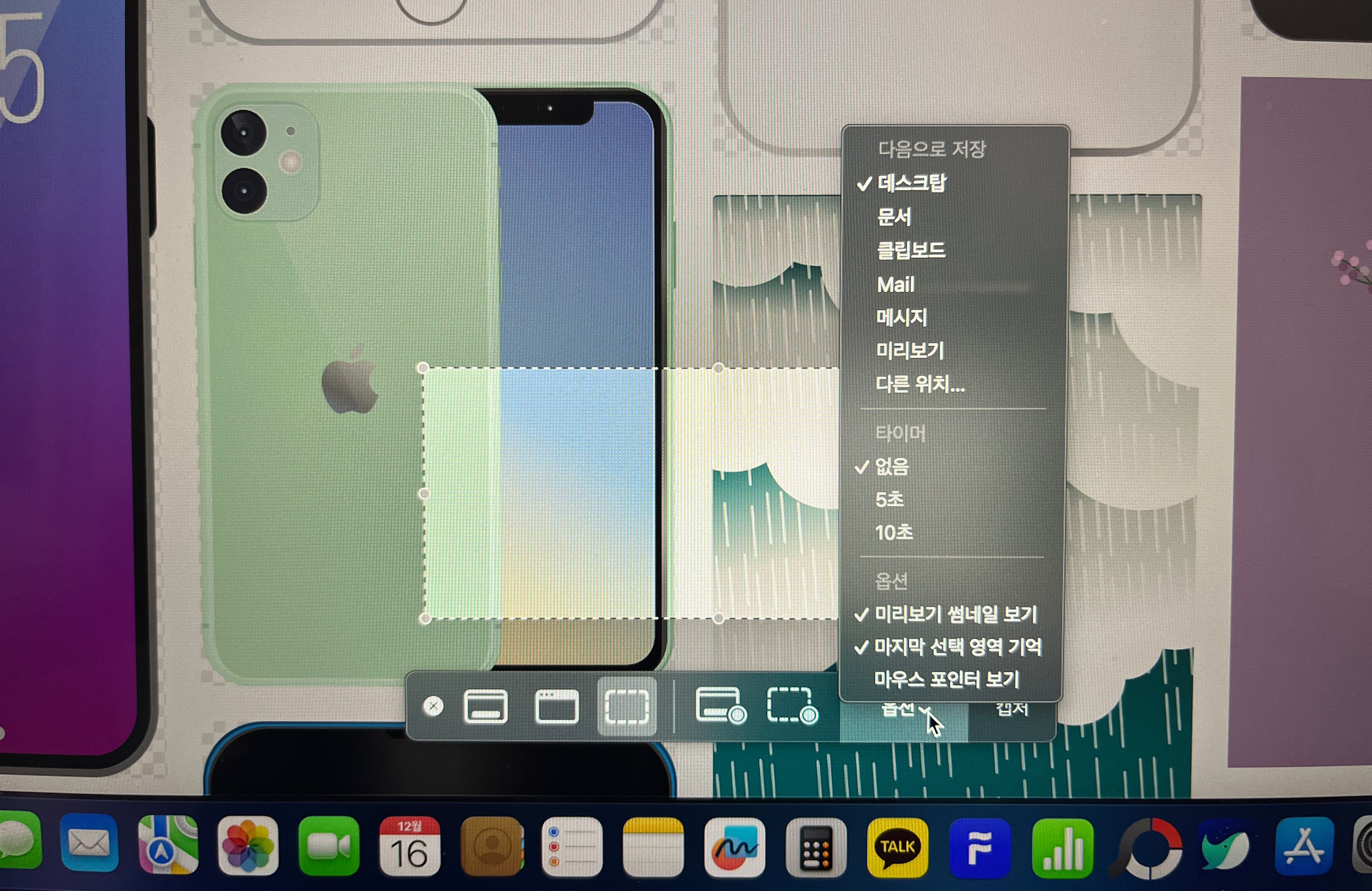 맥북 캡쳐 단축키를 통하여 캡쳐를 했을 때 자동으로 저장이 되는데 저장 위치를 설정하는 것도 쉬프트+커맨드+5번 키를 통하여 할 수 있다. 오른쪽에 보이는 옵션을 누르면 저장 위치와 타이머 등을 설정할 수 있다. 마우스 포인터 보기도 설정을 통하여 커서를 없애거나 보이게 설정을 할 수 있다.