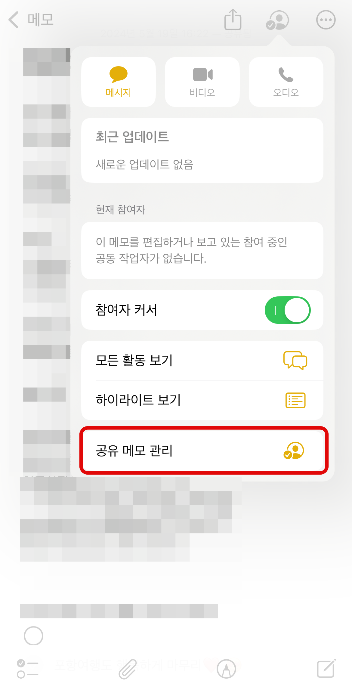 상대방이 공유를 받으면 아이폰 메모 공동작업이 모두 끝나며 공동작업 메모 왼쪽에는 사람모양이 나올 것이다. 그 메모는 공동작업을 하는 사람들과 바로 실시간으로 메모 공유가 가능하며 들어가서 상단에 있는 사람모양을 눌러보면 여기서 최근 업데이트 된 것을 확인할 수 있다. 그리고 현재 메모에 들어와서 작업을 하는 사람도 실시간으로 볼 수 있다. 그리고 가장 밑에 있는 공유 메모 관리를 들어가 보자.
