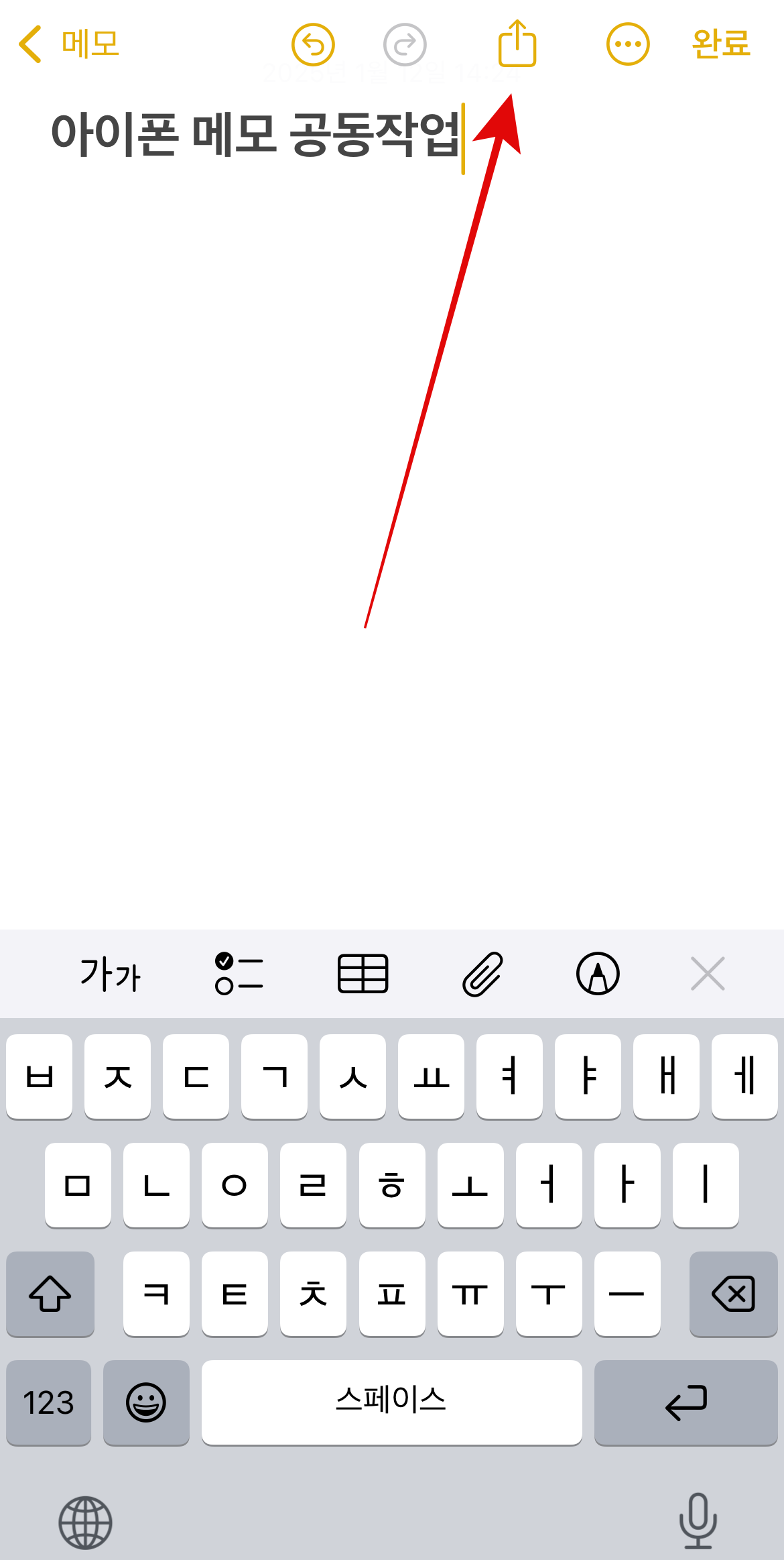 아이폰 메모 공동작업을 하기 위해서 메모에 들어와서 오른쪽 아래에 있는 새로운 메모를 열어준다. 기존에 사용하던 메모를 공동작업으로 사용하려면 그 메모에 들어가도 상관없다. 그리고 메모를 작성하거나 작성하기 전에 위에 보이는 공유버튼을 누른다. 그러면 '복사본 보내기'라고 되어있는 버튼을 눌러서 공동 작업으로 바꾸어 준다. 그리고 공유를 하고자 하는 상대방에게 공유를 한다.