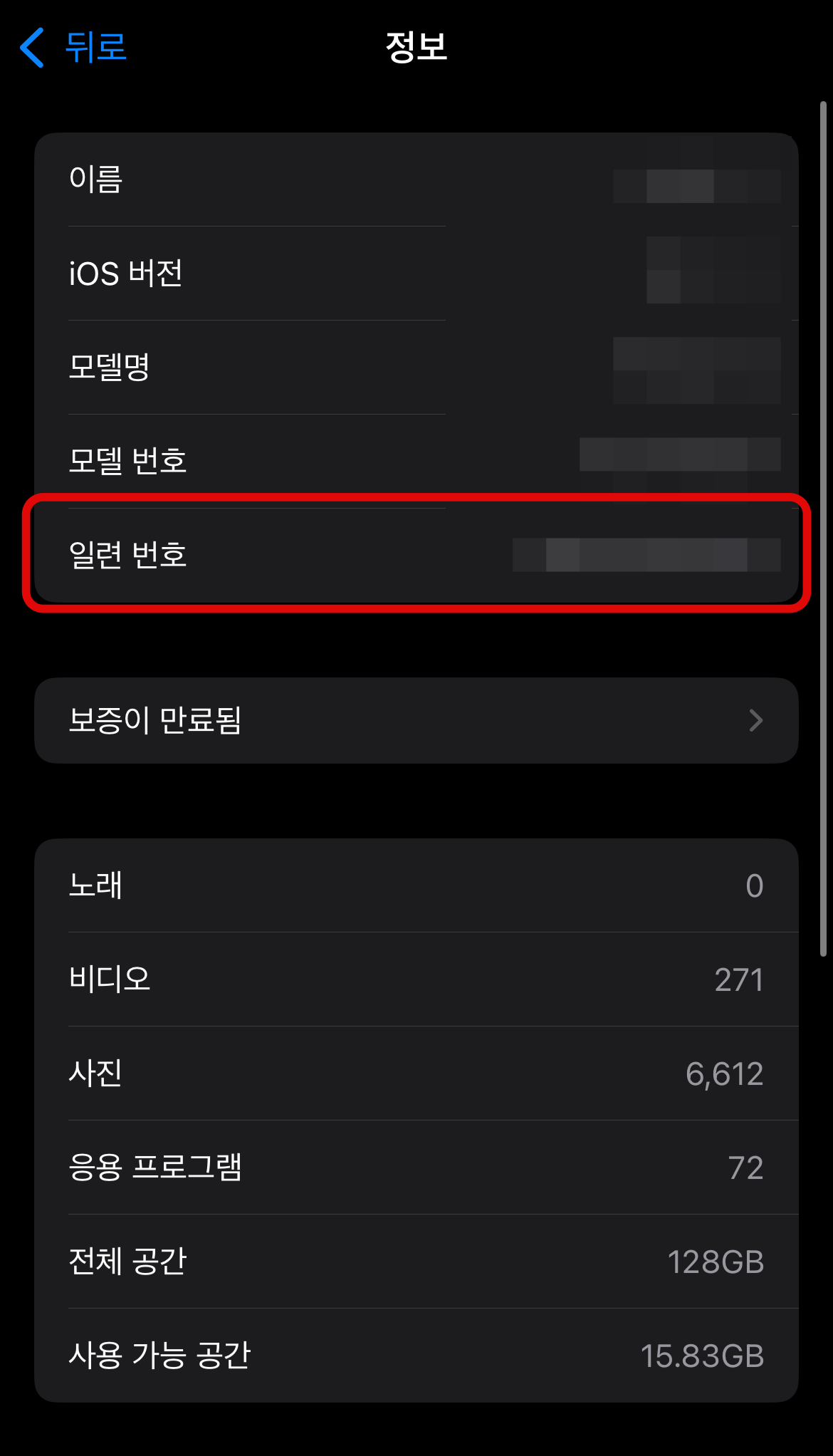 애플 아이폰 일련번호 조회하는 방법은 매우 간단하다. 설정에 들어가서 일반으로 들어간다 그리고 가장 위에 있는 정보에 들어가 보자. 그러면 나의 휴대폰에 대한 정보가 쭉 나열되는데 여기서 바로 일련번호를 확인할 수 있을 것이다. 다음으로 알아볼 것이 아이폰 일련번호랑 비슷한데 약간 다른 imei 조회하는 방법이다.