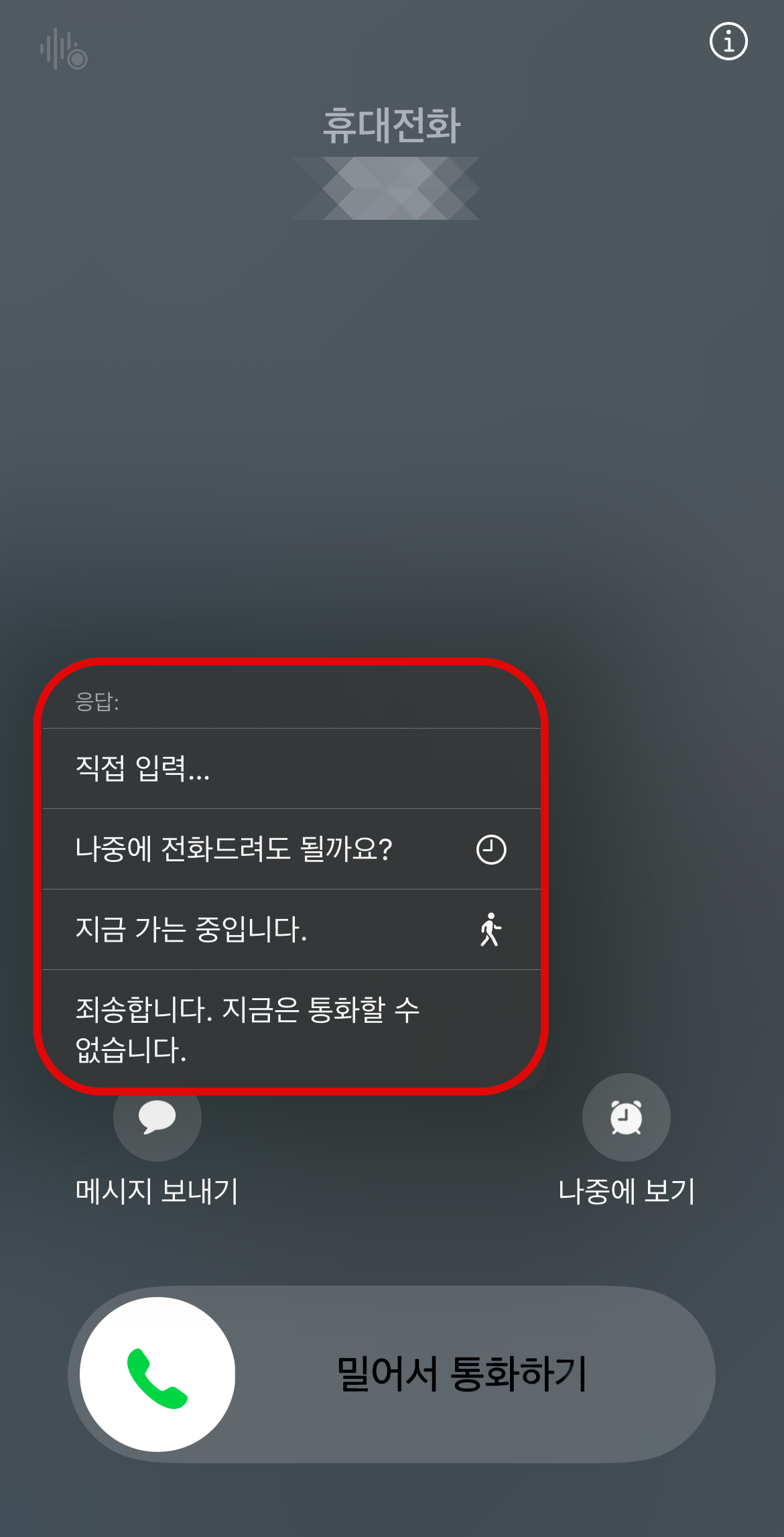 아이폰 통화거절하는 또 다른 방법이 있다. 전화가 왔을 때 메시지 보내기를 눌러서 원하는 문구나 멘트를 입력해서 선택을 하면 메시지가 보내지면서 통화거절이 된다. 기본적으로 정해진 멘트가 있고 내가 설정을 해 놓을 수도 있다. 이렇게 다양한 방법의 아이폰 통화거절 방법이 있다. 보기 쉽게 통화거절 버튼이 있어도 될 것 같은데 없어서 통화거절하기가 쉽지 않은 것 같다.