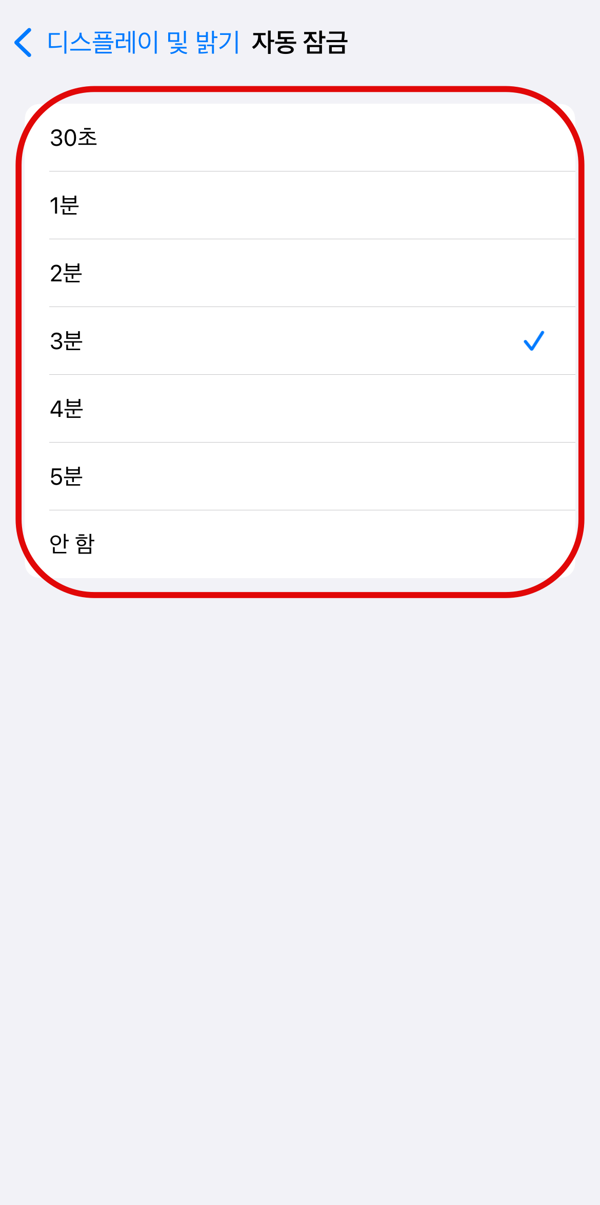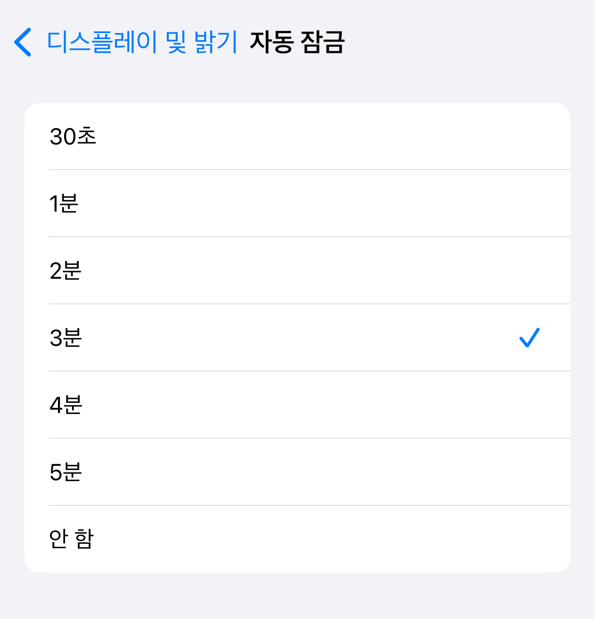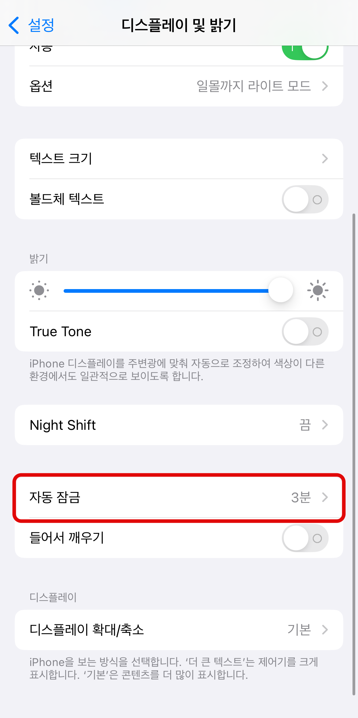 아이폰 화면 꺼짐 다음으로 자동 잠금이 짧게 설정되어 있는지 볼 수 있다. 설정에 들어가서 디스플레이 및 밝기로 들어가 준다. 그리고 스크롤을 쭉 내려 밑에 자동 잠금으로 들어간다. 기본으로 3분으로 설정이 되어있는데 30초나 1분으로 설정이 되어있다면 아이폰을 만지지 않고 가만히 놔뒀을 때 금방 화면이 꺼지는 것을 확인할 수 있을 것이다. 자신에게 맞는 시간을 설정하도록 하자.