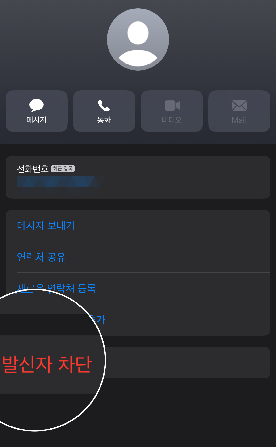 아이폰 스팸메세지 차단하는 방법은 매우 간단하다. 먼저, 차단하고 싶은 문자로 들어가자. 그리고 가운데 위에 있는 프로필을 누른다. 이 번호로 전화를 하거나 영상통화, 메일을 보낼 수 있는 화면이 나오는데 여기서 오른쪽에 있는 정보로 들어간다. 그러면 가장 아래에 발신자 차단이라는 붉은 글씨가 보일 것이다.
