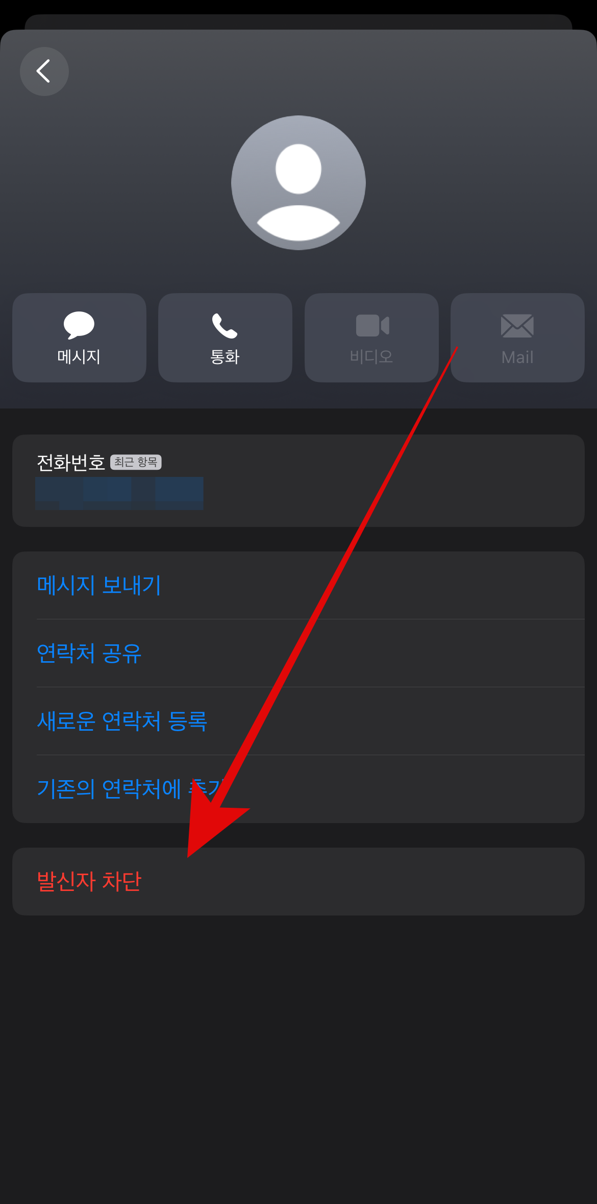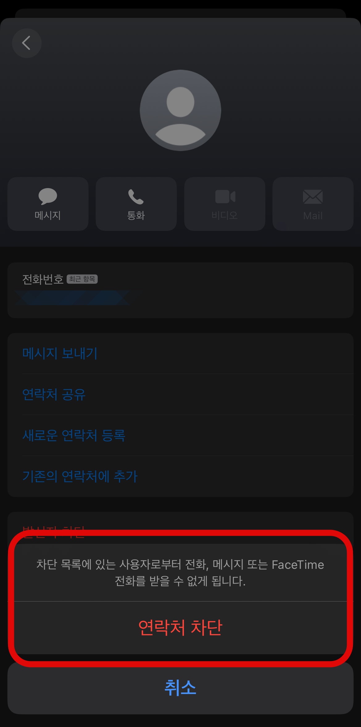 아이폰 스팸메세지 차단하는 방법은 매우 간단하다. 먼저, 차단하고 싶은 문자로 들어가자. 그리고 가운데 위에 있는 프로필을 누른다. 이 번호로 전화를 하거나 영상통화, 메일을 보낼 수 있는 화면이 나오는데 여기서 오른쪽에 있는 정보로 들어간다. 그러면 가장 아래에 발신자 차단이라는 붉은 글씨가 보일 것이다.