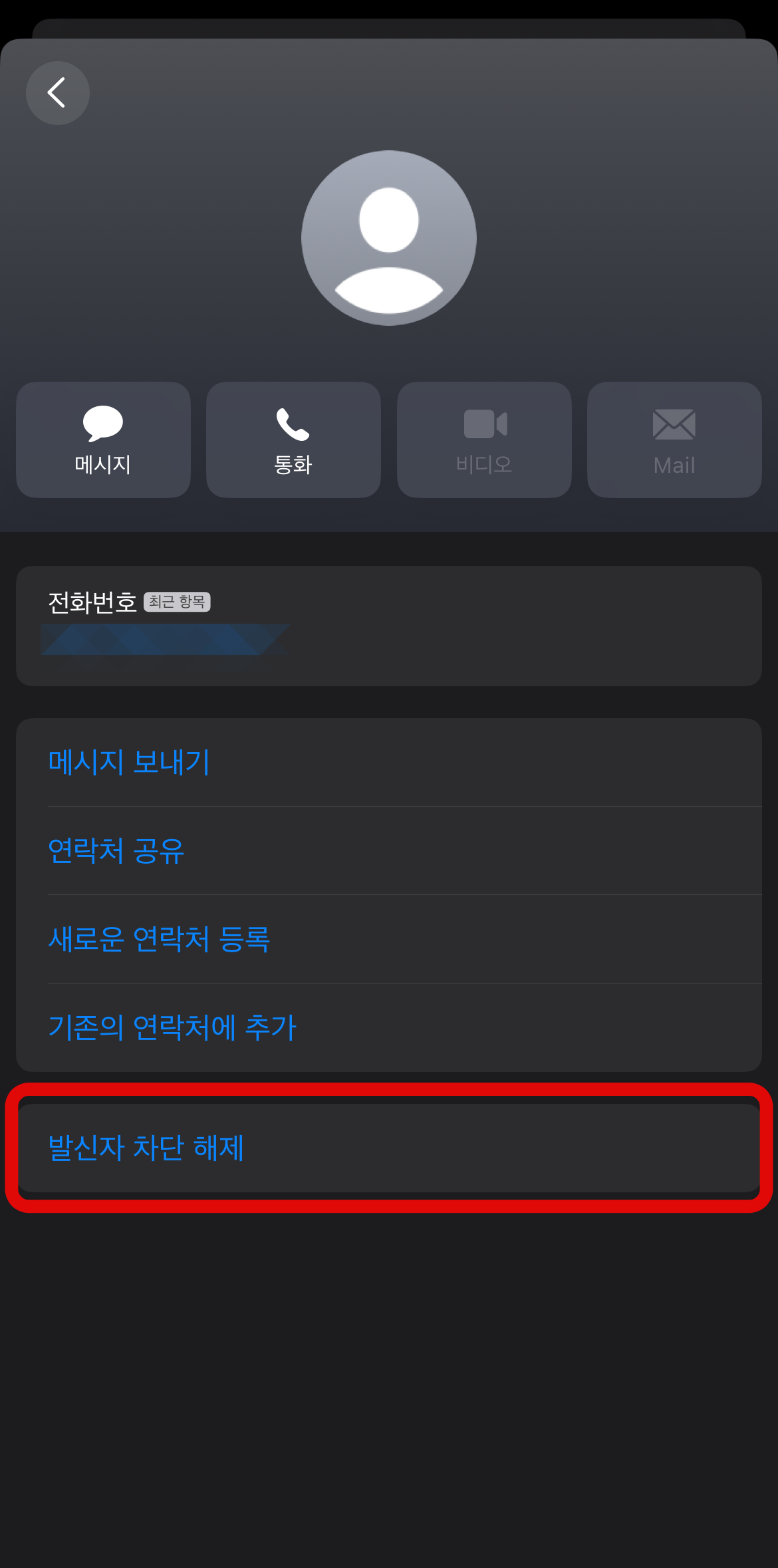 발신자 차단을 누르면 전화, 메세지 또는 페이스타임 전화를 받을 수 없게 됩니다.라는 문구와 함께 연락처 차단을 할 수 있다. 발신자 차단이 있던 자리에 발신자 차단 해제라는 버튼이 있으면 스팸메세지 차단이 제대로 된 것이다. 실수로 다른 번호를 차단했다면 아이폰 스팸문자함에 갈 필요 없이 여기서도 바로 차단 해제가 가능하다. 혹시 오래전에 차단을 해서 이 방법으로 차단해제를 할 수 없다면 아이폰 스팸문자함에 들어가서 확인 및 차단해제를 할 수 있다.
