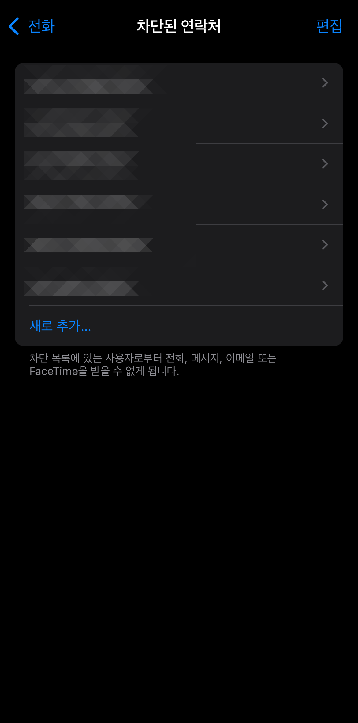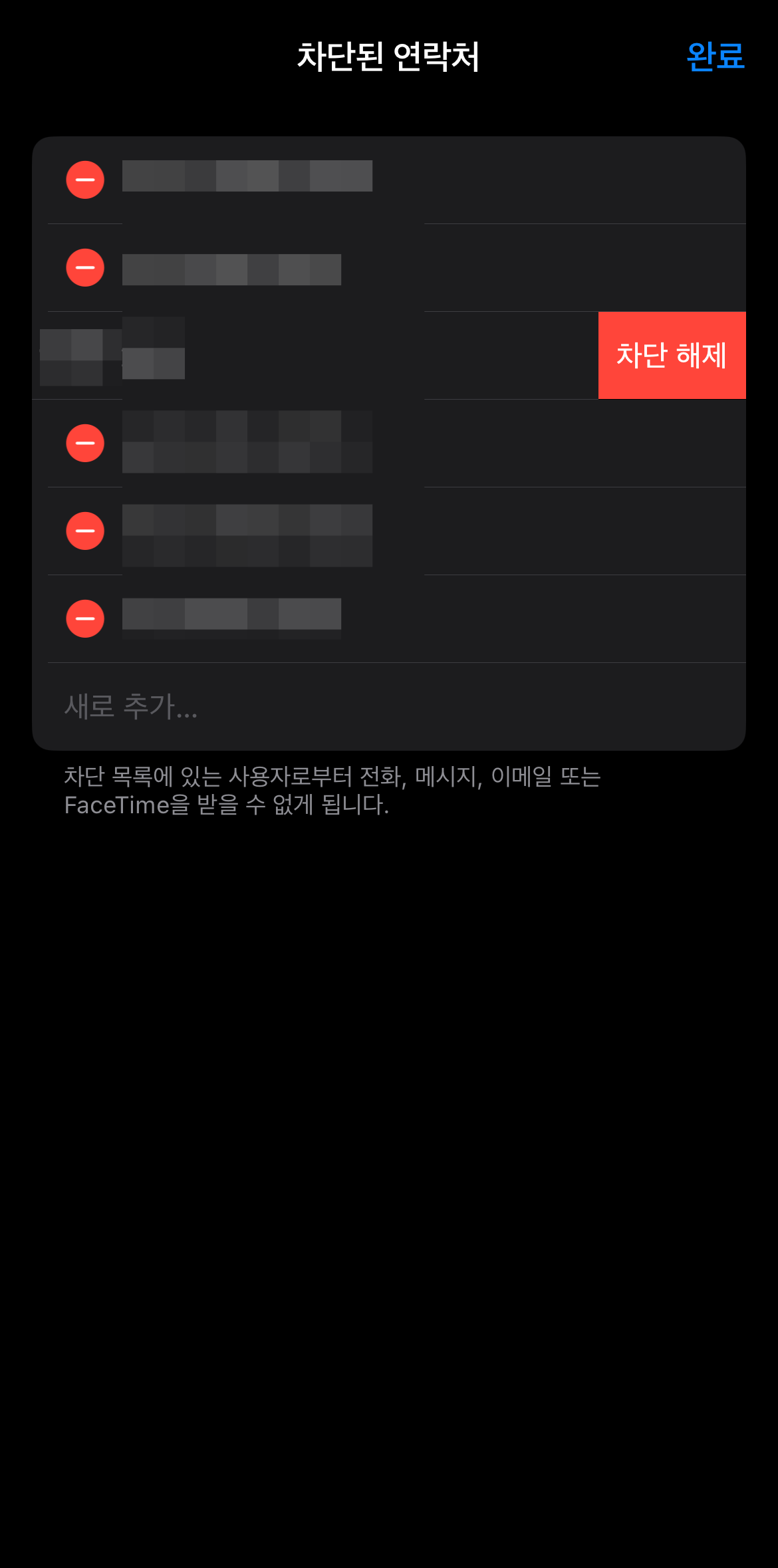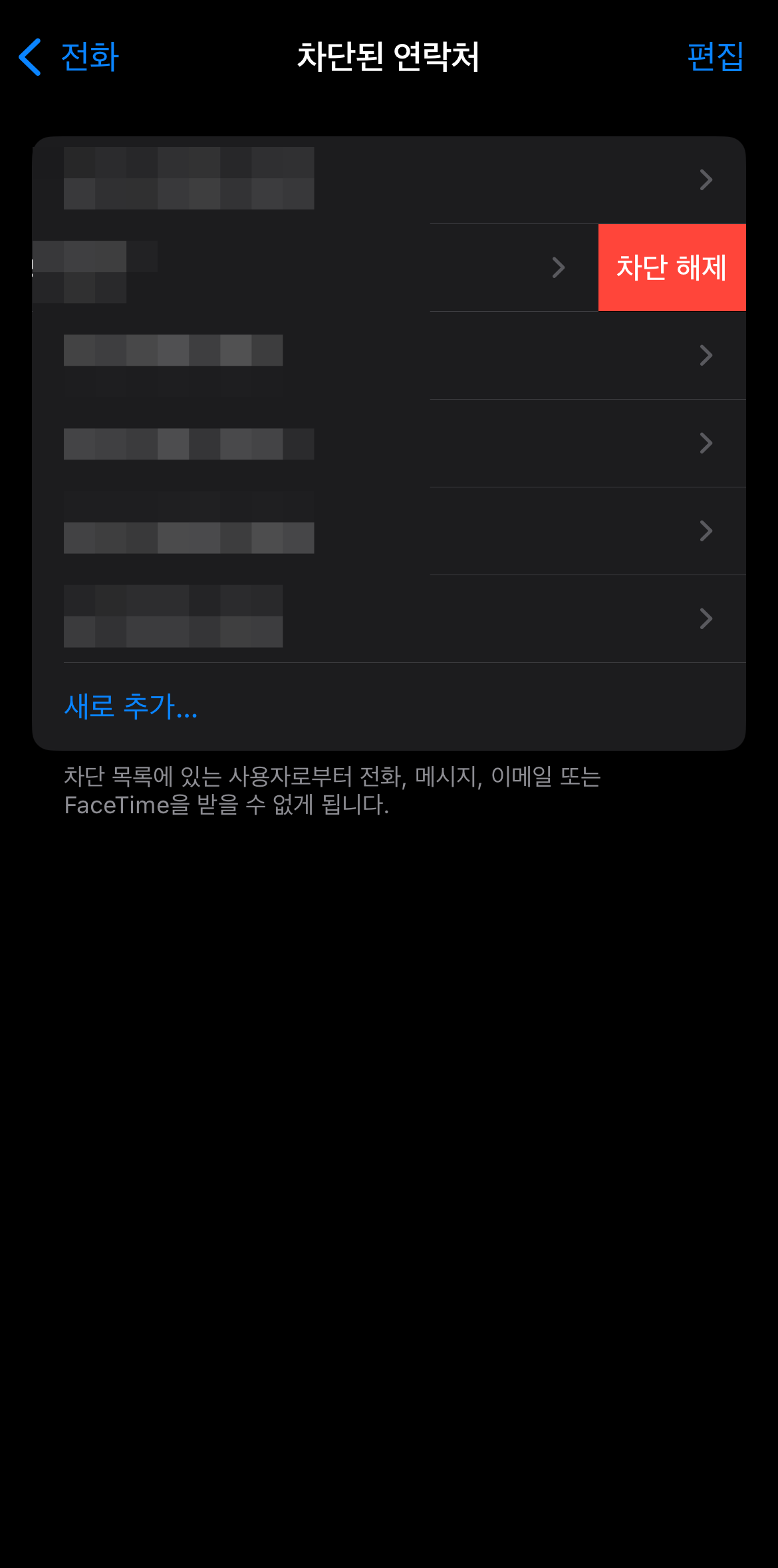 아이폰 스팸문자함에 들어오면 이때까지 차단을 했던 연락처들이 쭉 나열될 것이다. 여기서 차단해제를 하고 싶은 번호가 있다면 왼쪽으로 스와이프를 해서 차단 해제를 할 수 있고 오른쪽 위에 있는 편집버튼으로도 차단 해제를 할 수 있다.