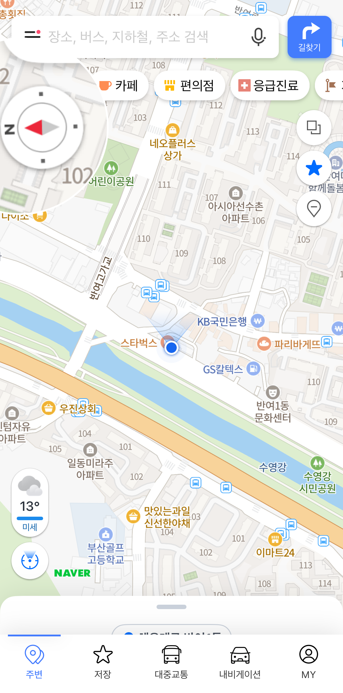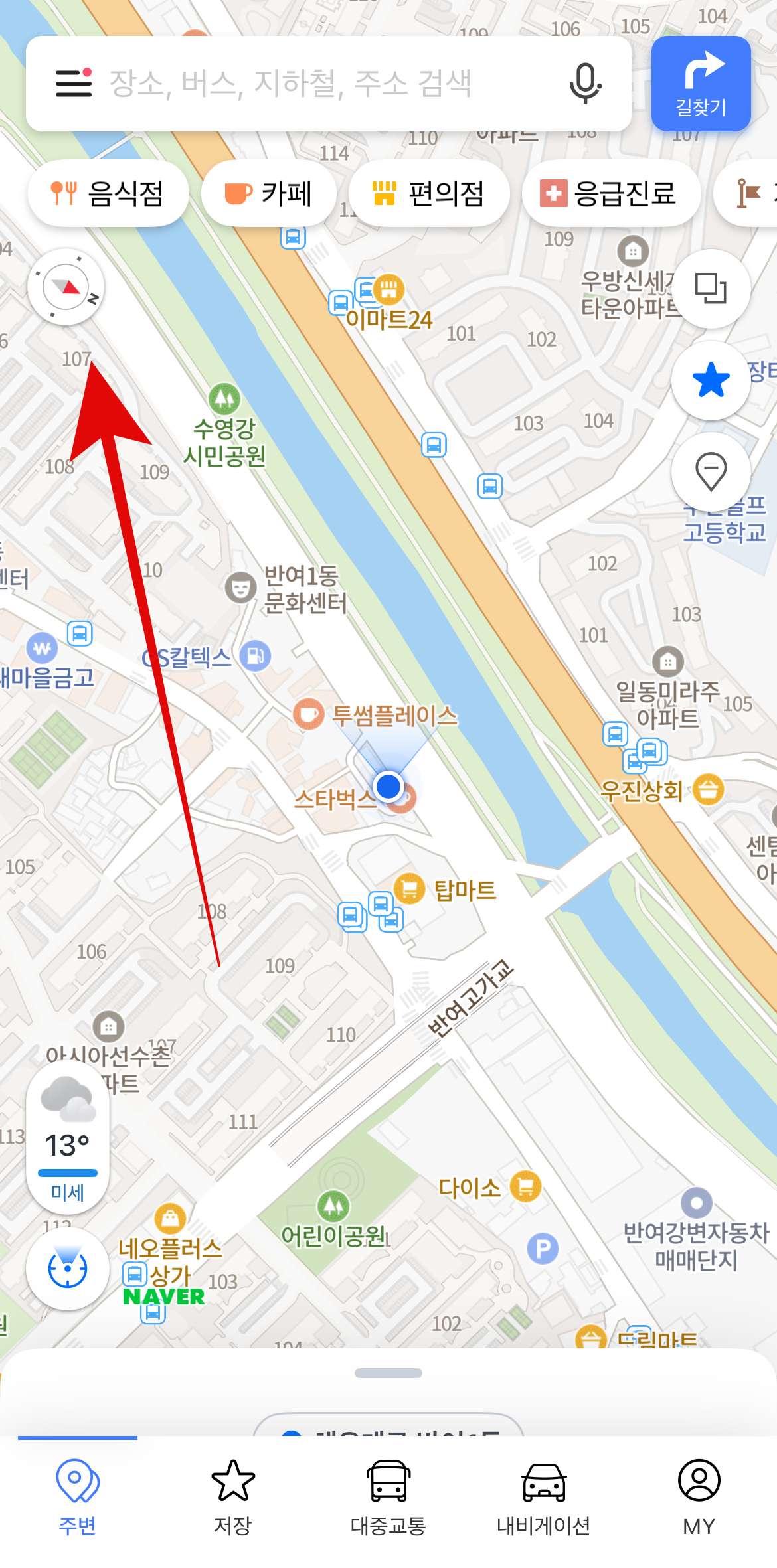 네이버 지도 나침반 설정을 하기 위해서 먼저 네이버 지도에 들어간다. 네이버 지도에서 주변이나 내비게이션을 눌러주면 지도가 나올 것이다. 여기서 왼쪽 아래에 있는 동그란(현재위치표시) 버튼을 눌러보자. 그러면 왼쪽 위에 작은 나침반이 생긴 것을 볼 수 있을 것이다. 네이버 지도 어플에 위치서비스 공유를 허용하지 않았다면 설정에 들어가서 허용을 해야 사용이 가능하다.