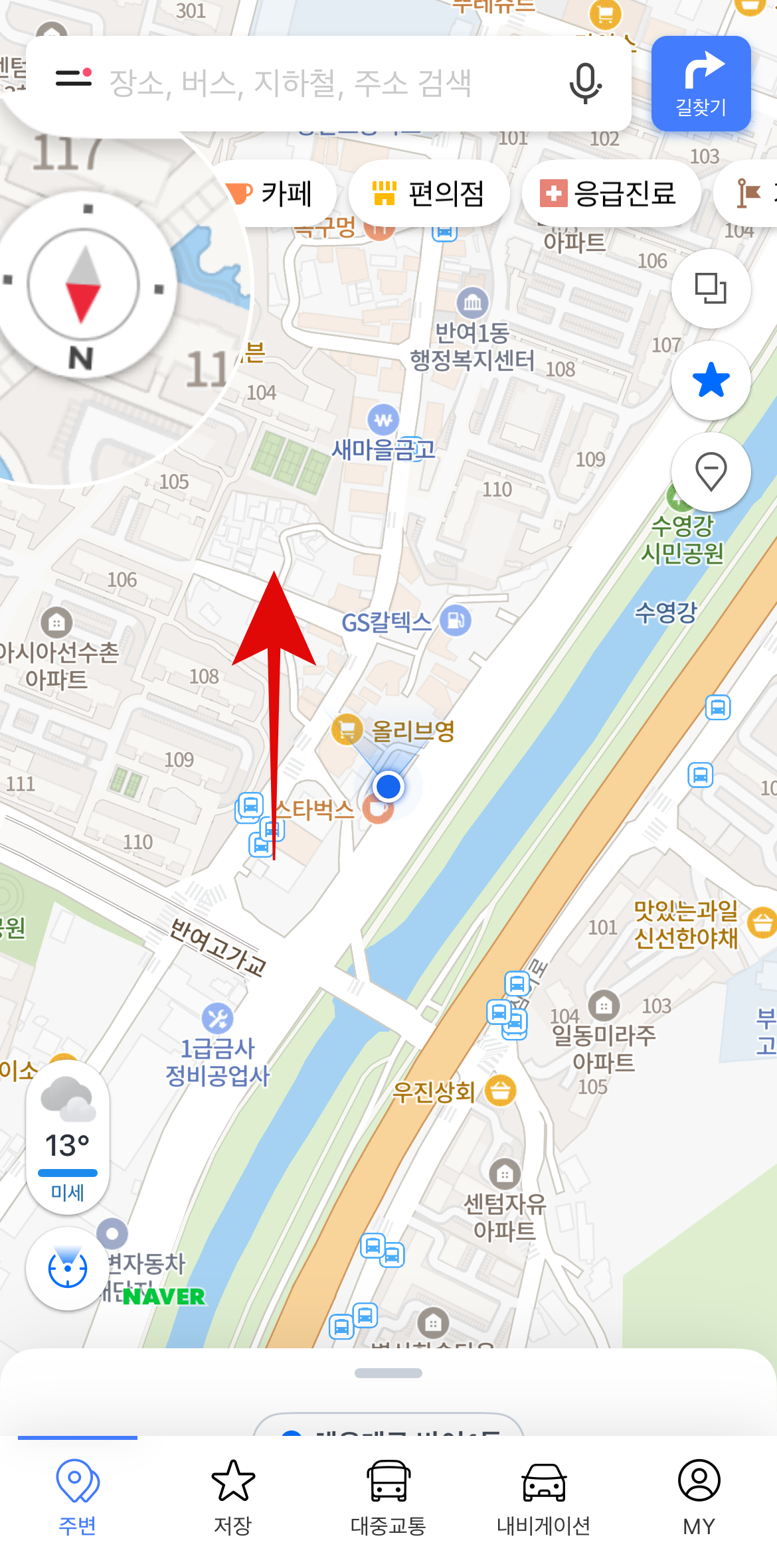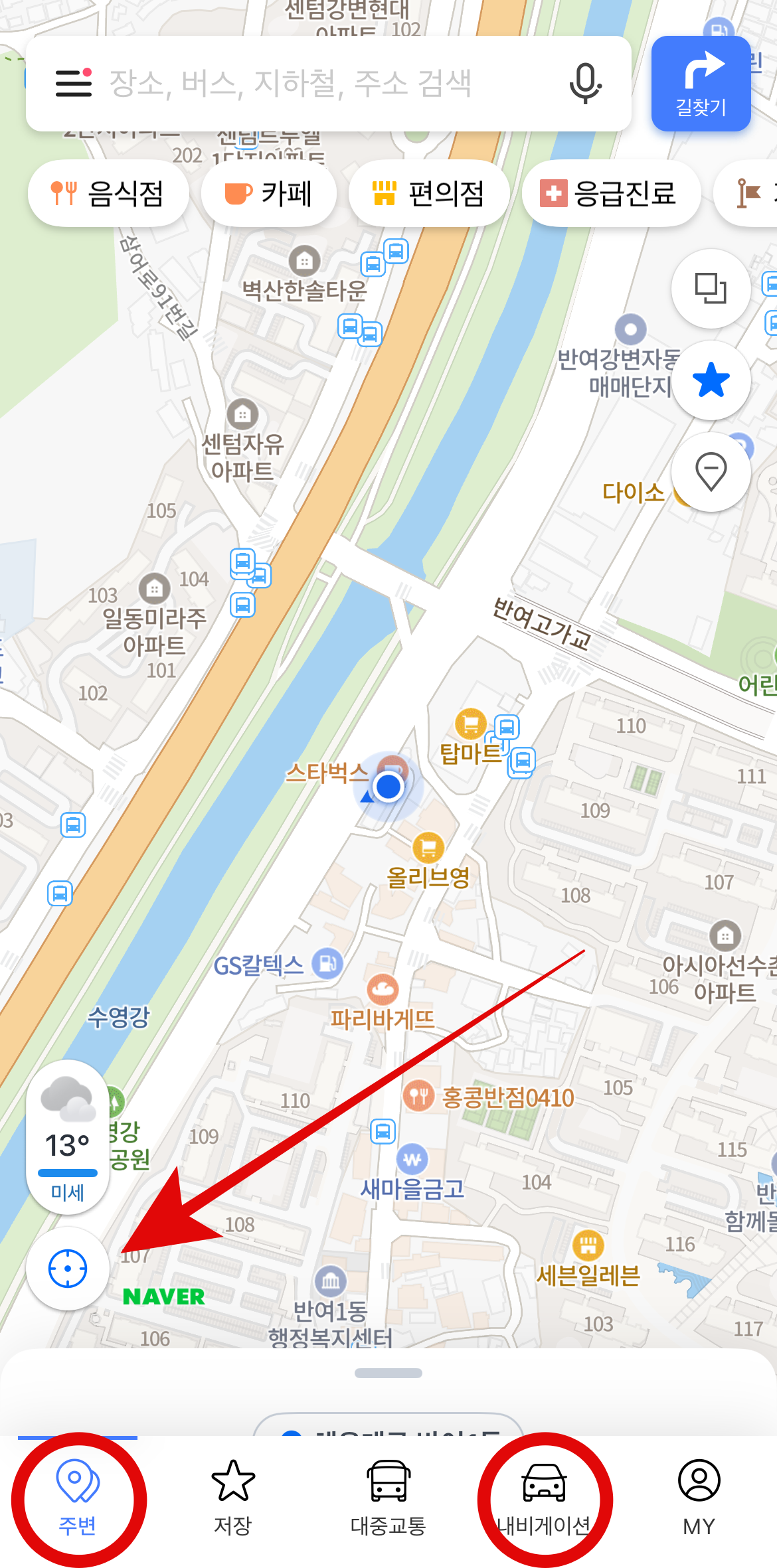 네이버 지도 나침반 설정을 하기 위해서 먼저 네이버 지도에 들어간다. 네이버 지도에서 주변이나 내비게이션을 눌러주면 지도가 나올 것이다. 여기서 왼쪽 아래에 있는 동그란(현재위치표시) 버튼을 눌러보자. 그러면 왼쪽 위에 작은 나침반이 생긴 것을 볼 수 있을 것이다. 네이버 지도 어플에 위치서비스 공유를 허용하지 않았다면 설정에 들어가서 허용을 해야 사용이 가능하다.