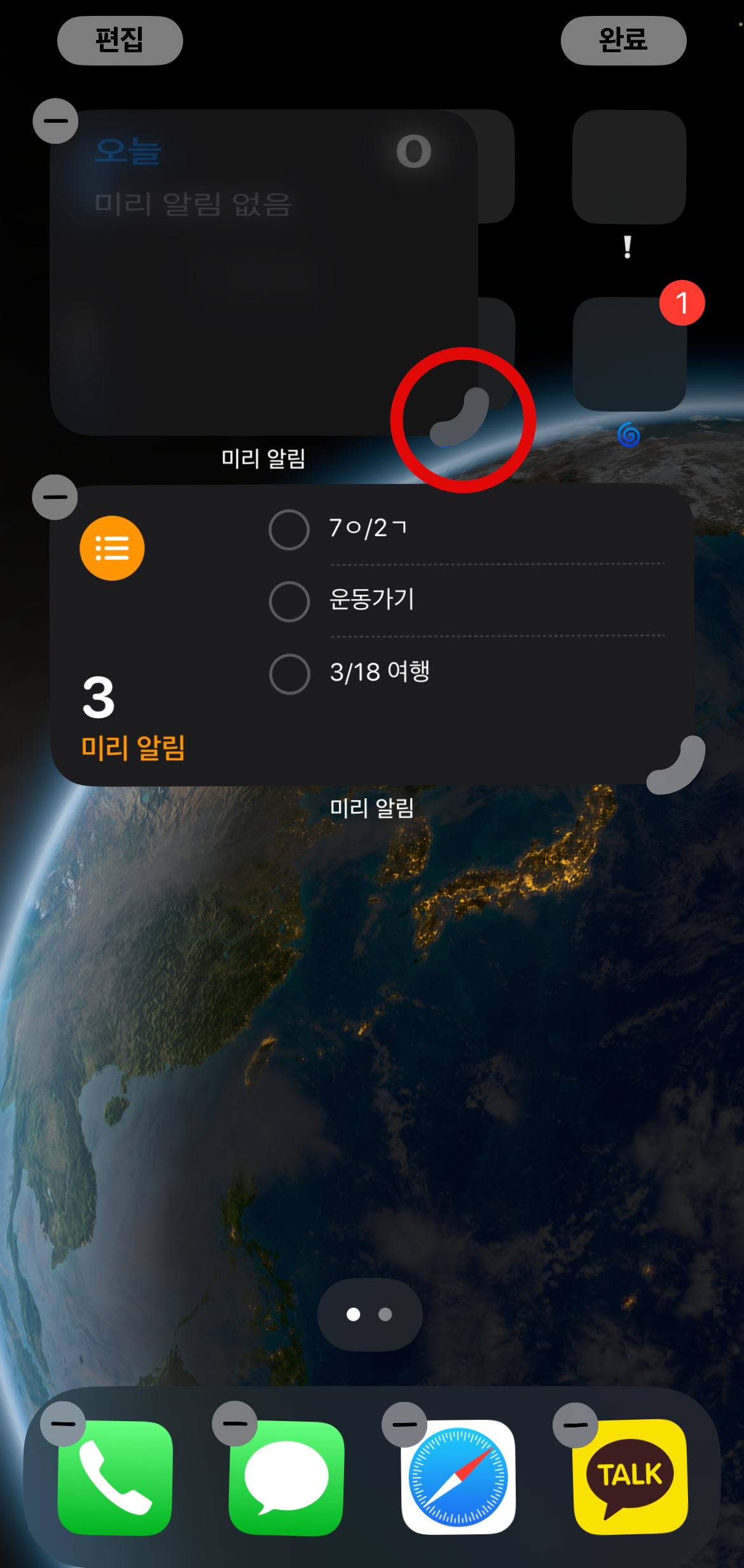 원하는 형식의 위젯을 골라서 아래에 보이는 위젯 추가를 누르면 된다. 그러면 배경화면에 위젯이 추가된 것을 볼 수 있으며 위젯 오른쪽 아래에 있는 버튼을 드래그해서 아까 봤던 크기의 위젯 형식으로도 설정이 가능하다. 원하는 위젯으로 설정 후 완료 버튼을 누르면 아이폰 미리 알림 위젯 설정이 완료된다.