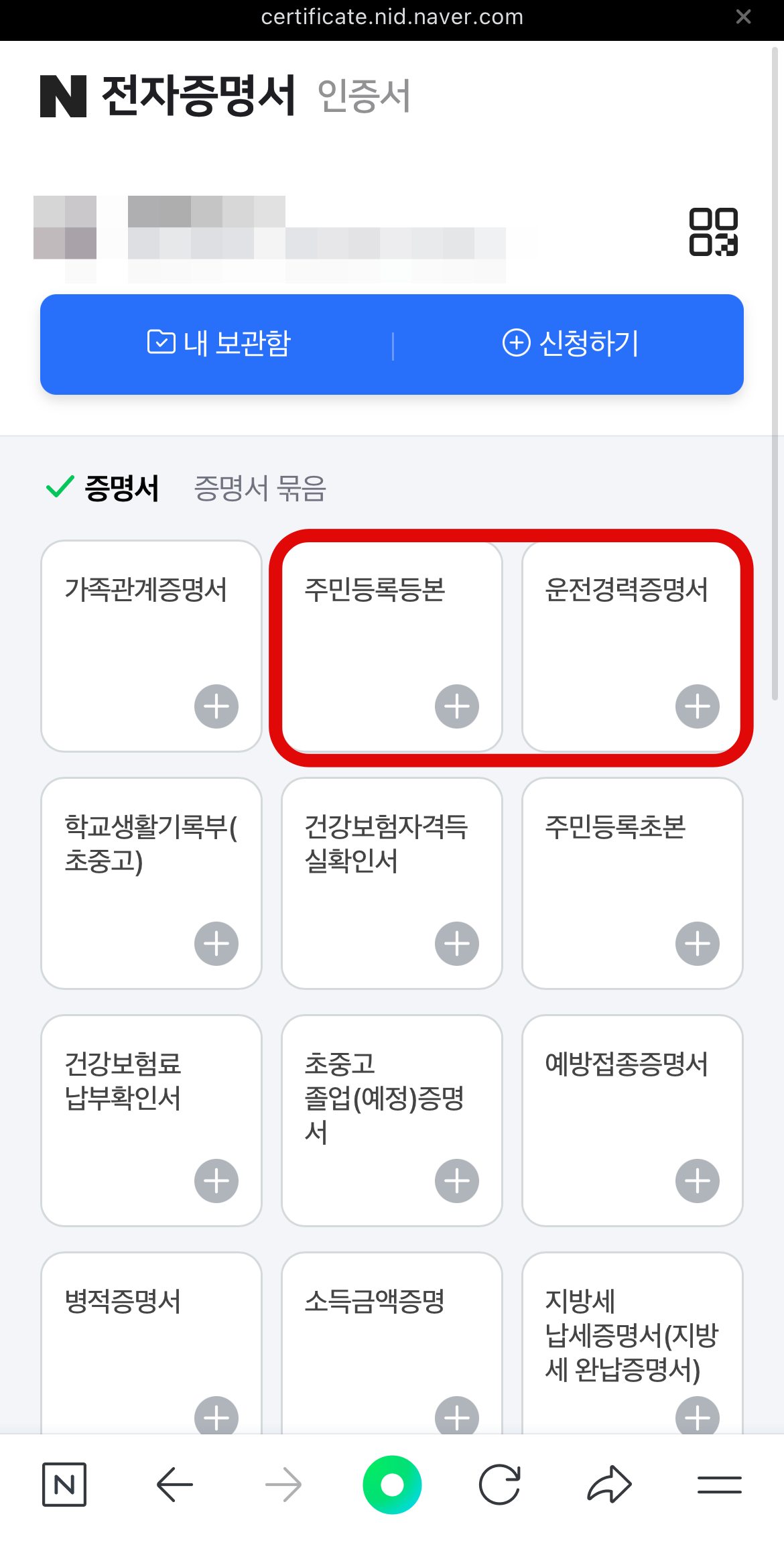 전자증명서를 누르면 '주민등록등본, 졸업증명서 등 쉽게 발급하고 꺼내 쓰세요.'라는 문구와 함께 전자증명서 신청하기 버튼이 보일 것이다. 필수약관 동의를 하면 어떠한 증명서를 발급받을 건지 선택을 할 수 있다. 여기서 네이버 모바일 신분증 발급을 위해서는 주민등록등본이나 운전경력증명서를 선택하도록 하자.