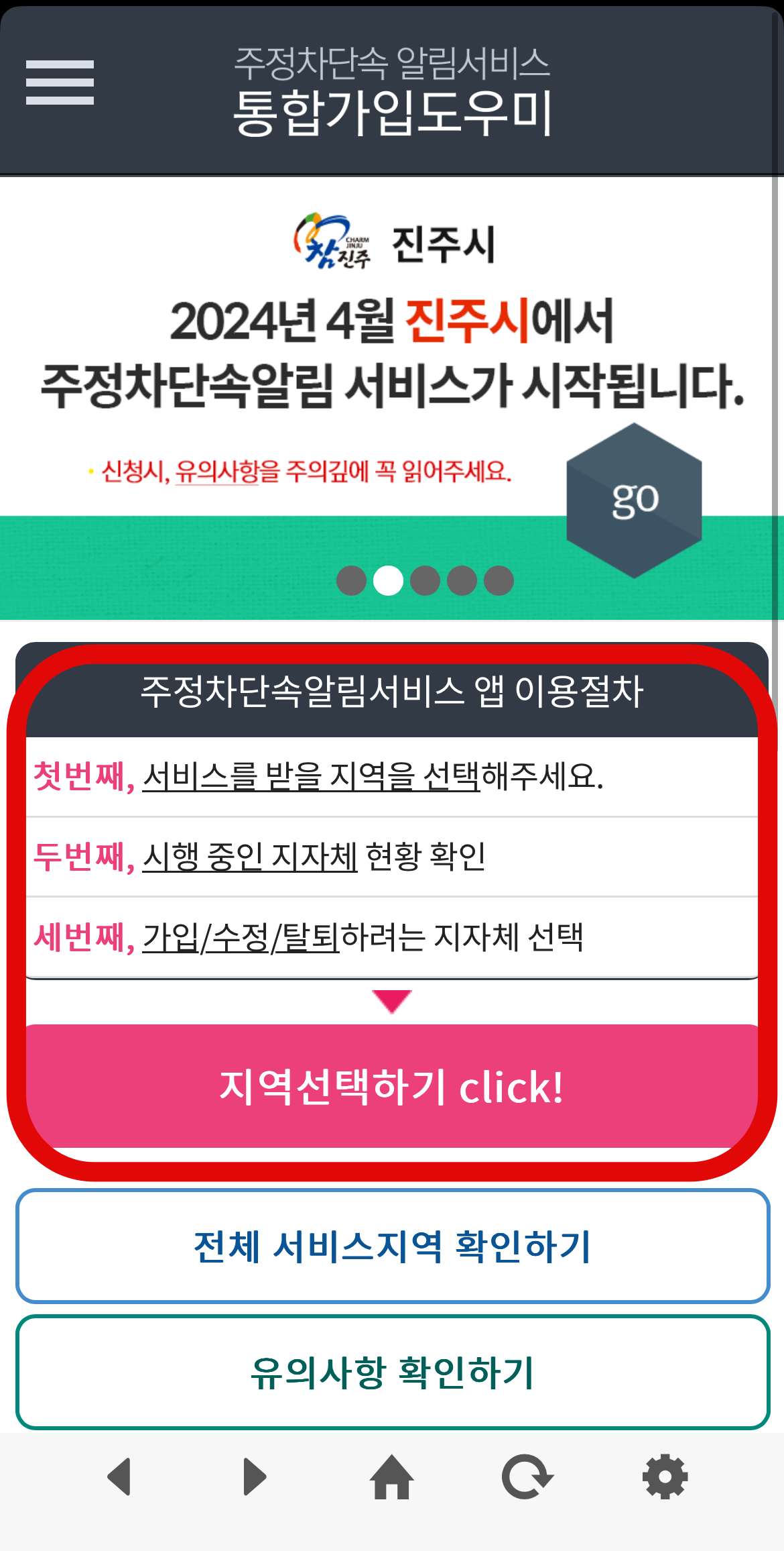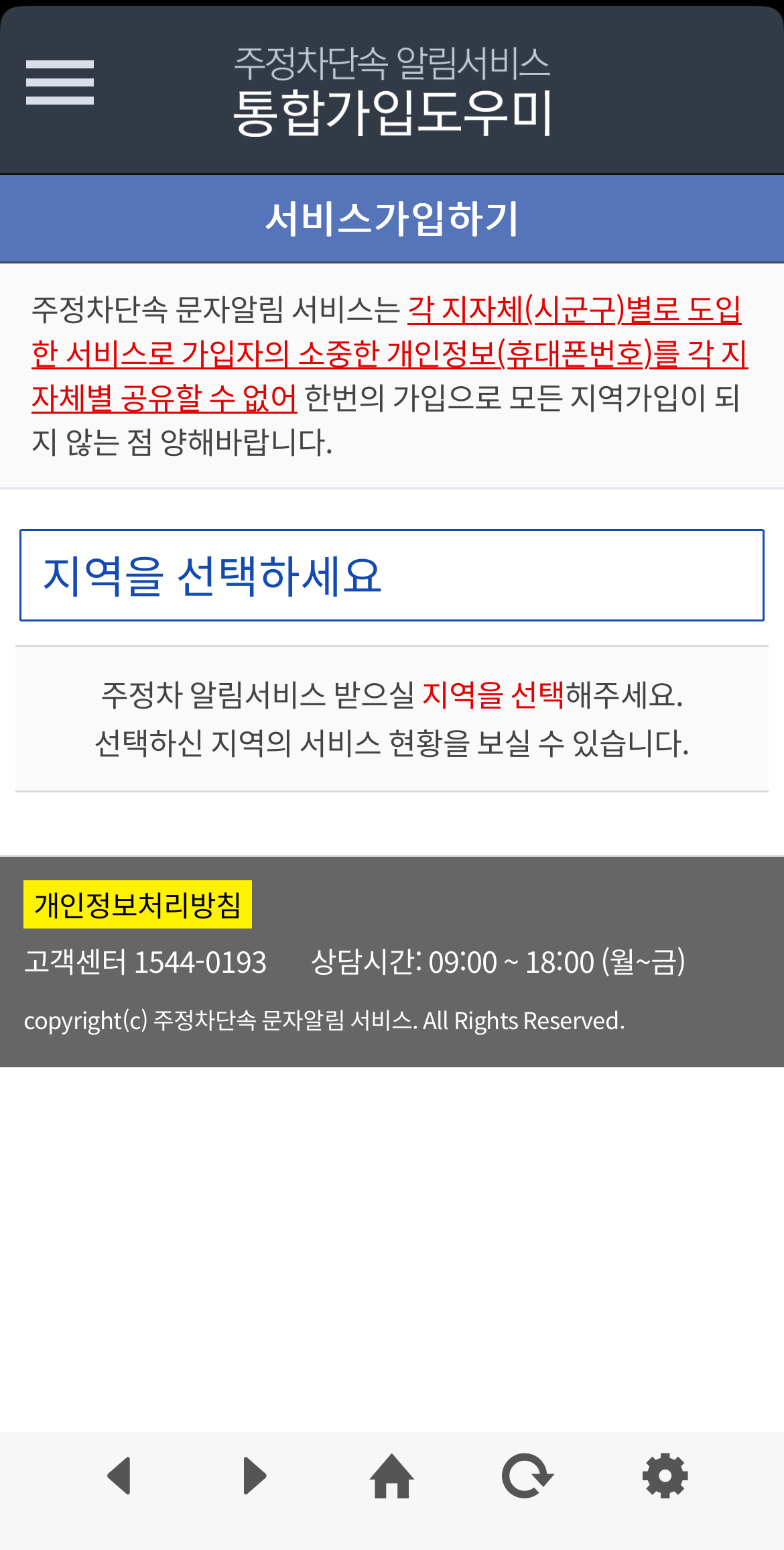 주정차단속알림 서비스는 휴대폰번호 하나에 한 지역만 신청을 할 수 있다. 먼저, 주정차단속알림 서비스 어플을 다운로드 후 자신이 주정차를 자주 하는 지역을 선택한다. 선택한 지역에서의 주정차단속만 문자를 받을 수 있다. 지역을 선택하고 서비스신청을 누르면 된다. 그러면 간단한 본인인증만 하면 신청이 완료된다. 혹시 지역을 잘못 선택했거나 지역을 변경하고 싶다면 왼쪽 아래에 있는 서비스 수정을 통하여 수정이 가능하다.