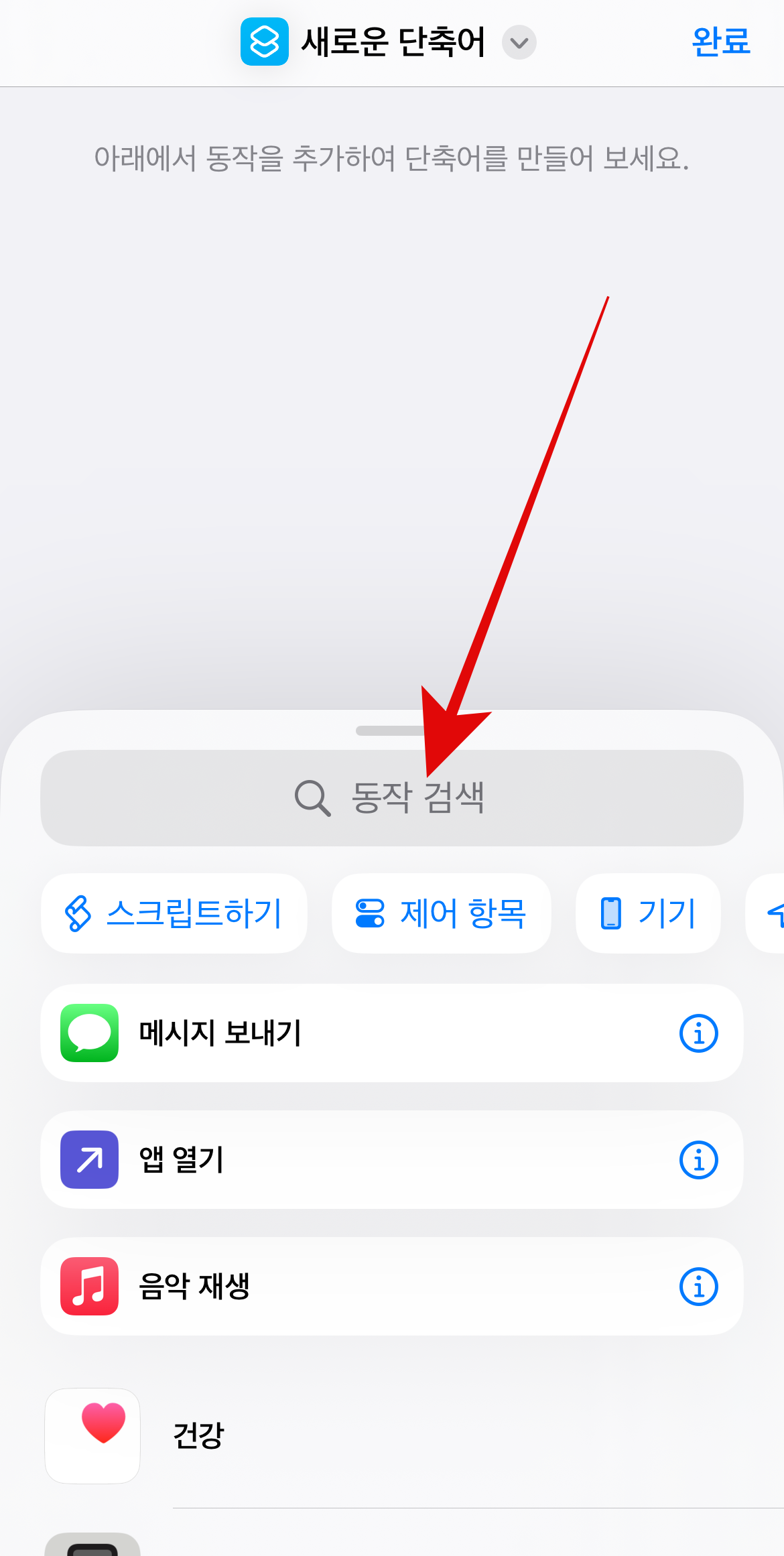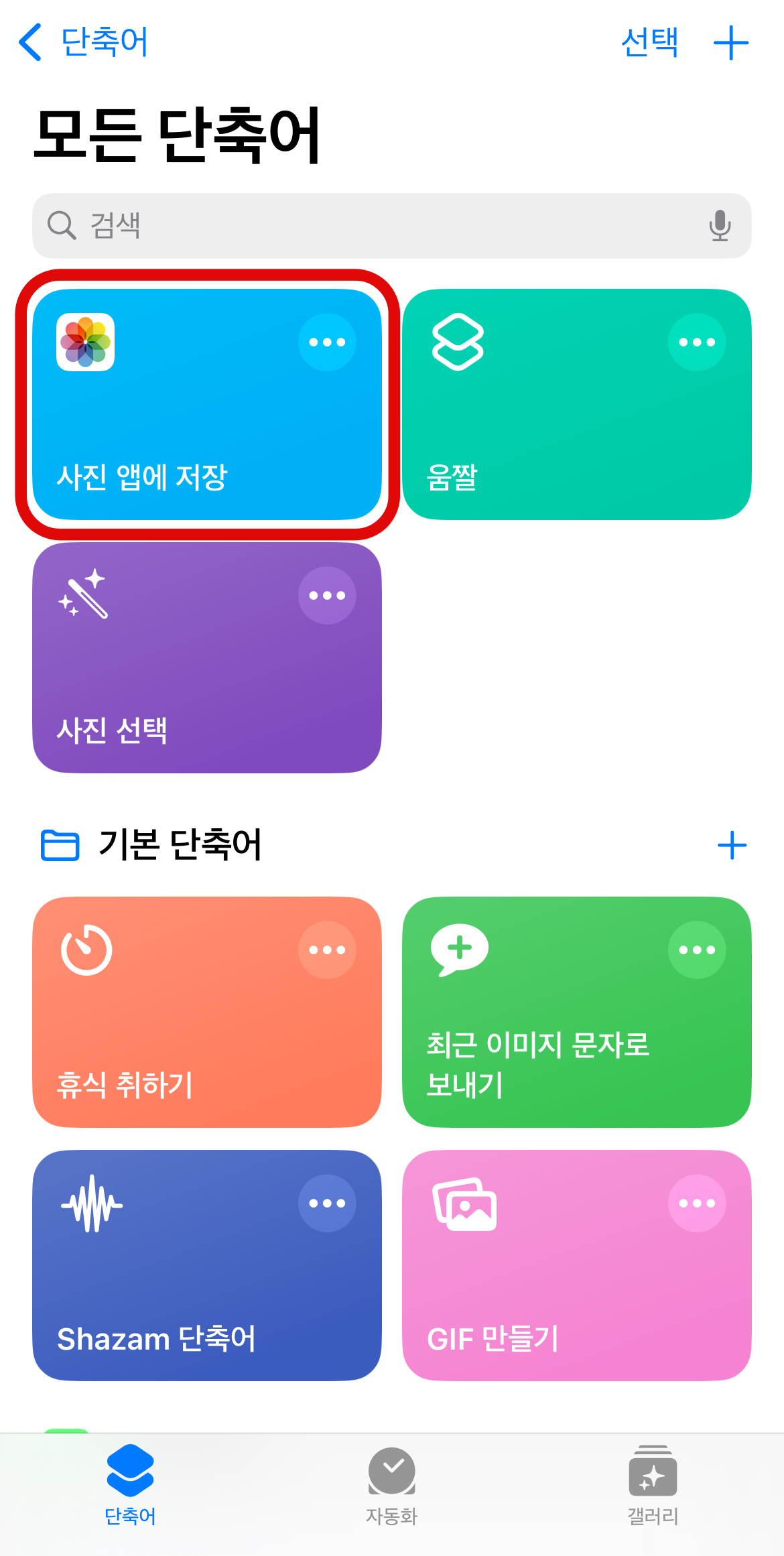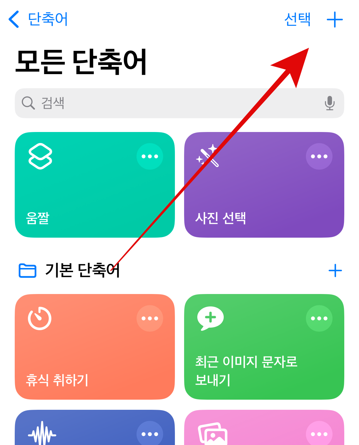 가장 먼저, 아이폰에 기본적으로 제공되는 단축어에 들어간다. 찾기가 어렵다면 검색을 통하여 단축어를 찾을 수 있다. 그리고 오른쪽 위에 있는 +버튼을 눌러보자.