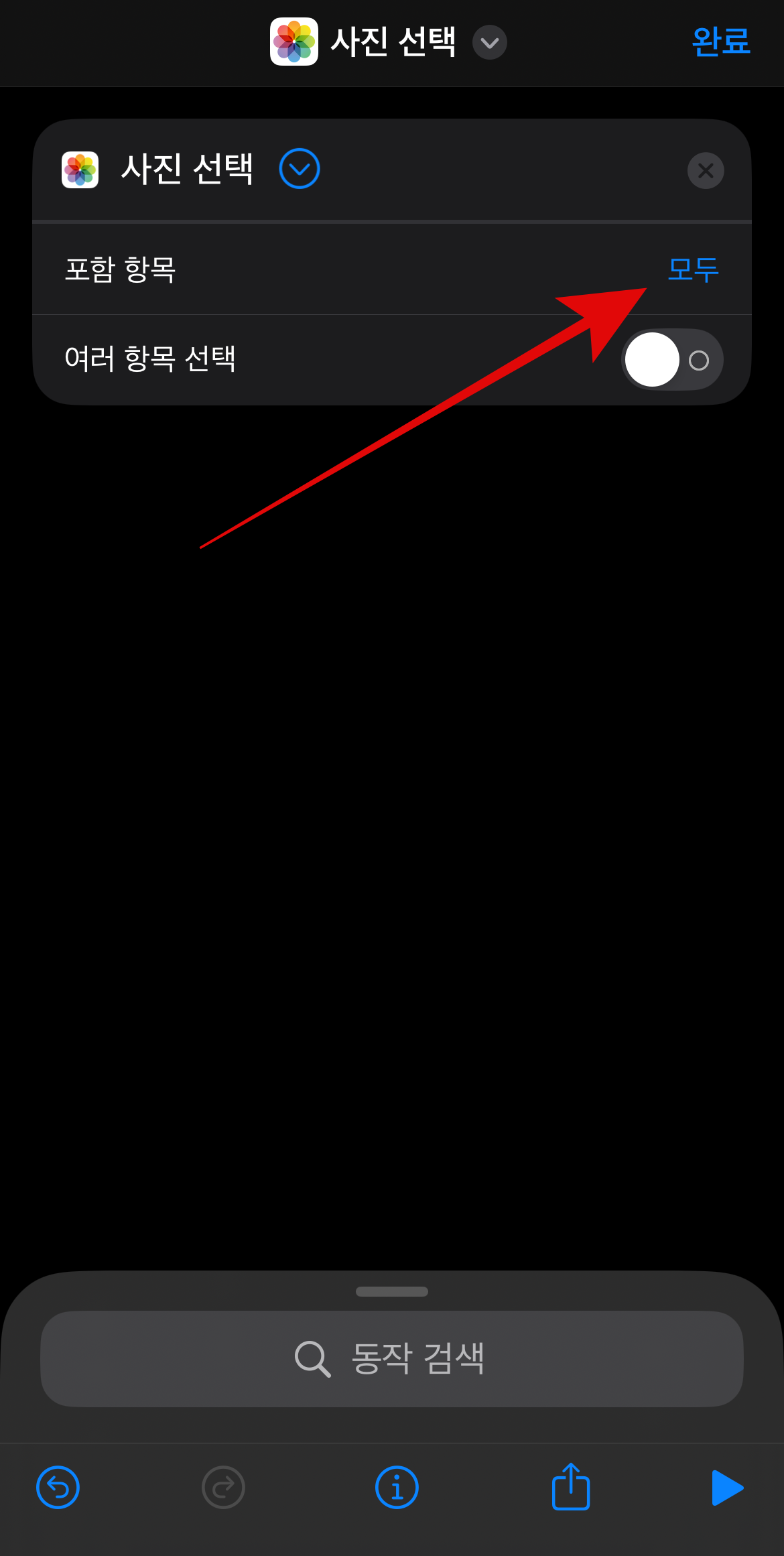 화살표를 누르면 포함 항목에 모두라고 되어있는 것을 볼 수 있다. 모두를 눌러서 들어간 후 이미지를 제외한 라이브포토와 비디오를 체크를 풀고 완료를 누르자.