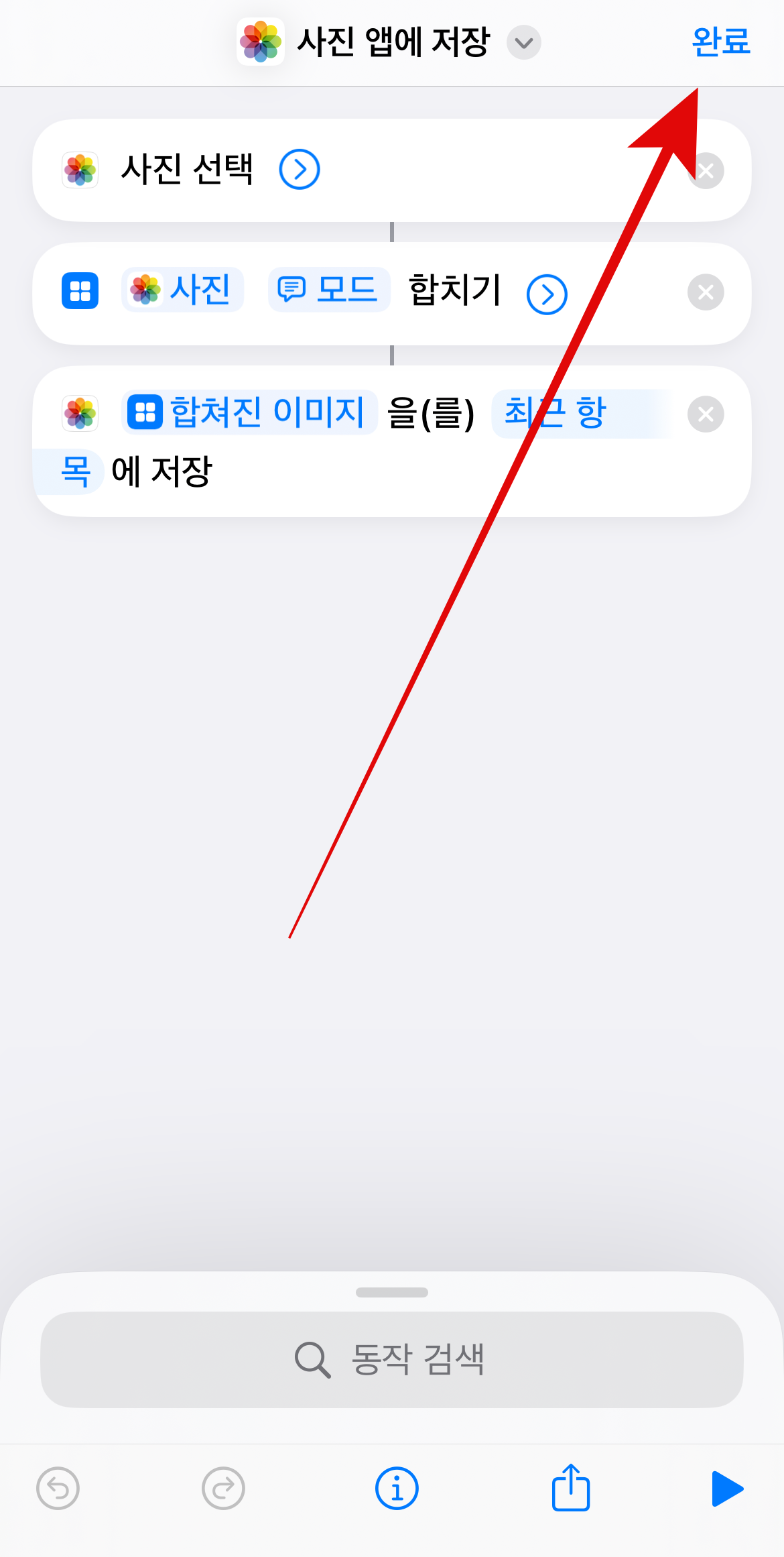 오른쪽 위에 있는 완료버튼을 누르면 사진 앱에 저장이라는 단축어가 만들어진 것을 볼 수 있다. 단축어를 눌러 합치고 싶은 사진을 선택하고 가로, 세로, 격자 중 원하는 옵션을 선택하면 사진첩에 사진이 합쳐져 저장되어 있을 것이다. 이렇게 어플 없이 아이폰 사진 합치기 단축어를 만들었다. 조금 길고 복잡했지만 이제는 만들어진 단축어만 누르고 사진을 선택하면 원하는 옵션으로 사진을 합칠 수 있다.