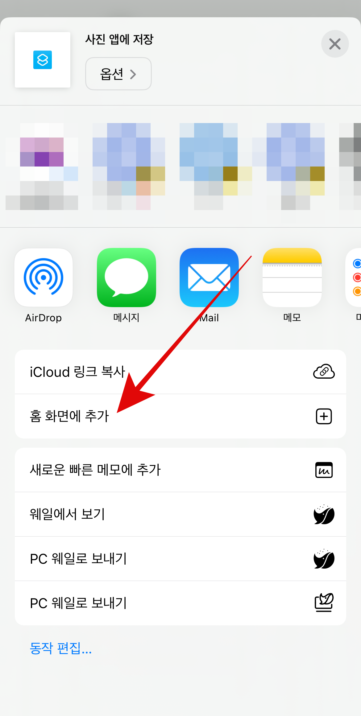 아이폰 사진 합치기를 할 때마다 단축어에 들어가야 하는 번거로움을 줄이기 위한 방법도 있다. 바로 공유를 통하여 홈화면에 앱처럼 만드는 것이다. 내가 만들어 놓은 단축어로 들어가서 아래에 보이는 공유하기를 눌러보자. 그러면 이 단축어를 공유가 가능한데 홈 화면에 추가를 눌러 원하는 색깔과 이모티콘, 이름을 수정하고 추가를 누르면 배경화면에서도 바로 사진을 합칠 수 있는 단축어가 나타날 것이다.