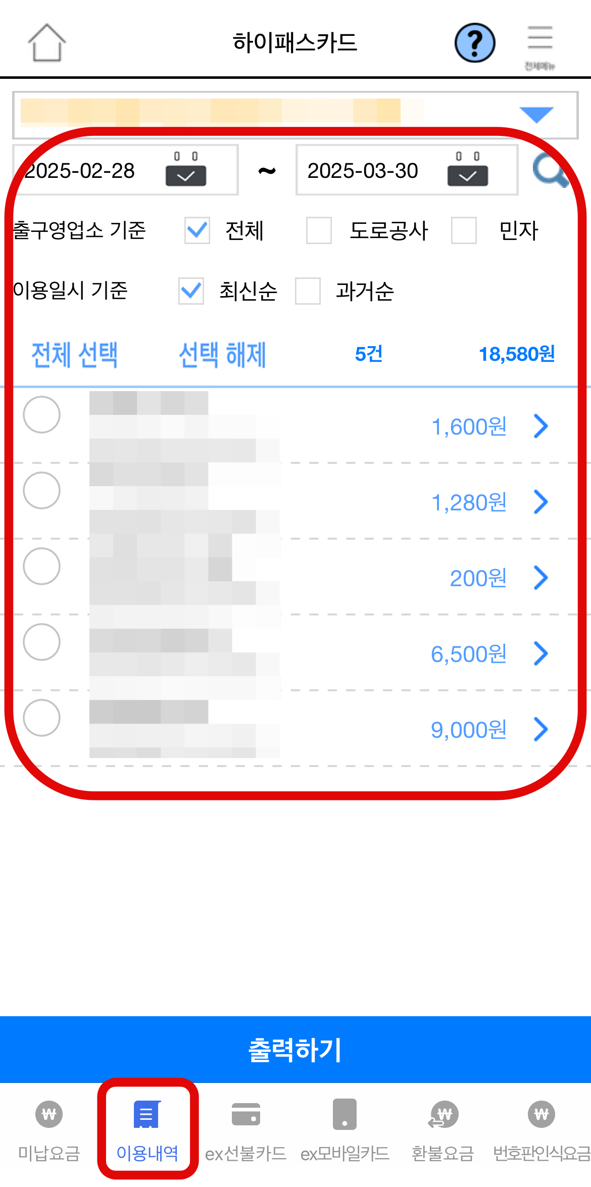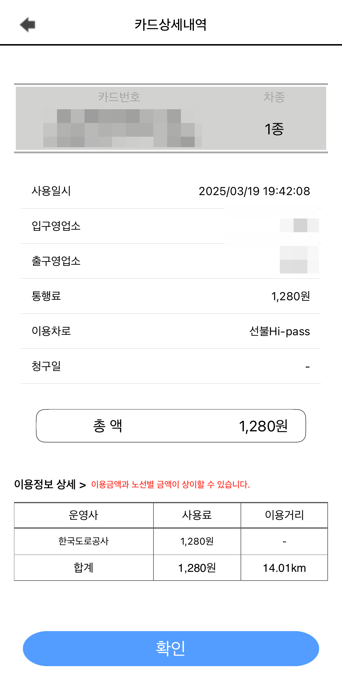 하이패스 카드를 등록을 하고 나서 홈으로 돌아와 이용내역으로 들어가면 하이패스 사용내역 조회가 가능하다. 날짜를 선택하여 원하는 날짜에 어떤 고속도로를 이용했는지 확인이 가능하며 그 이용내역을 누르면 상세정보를 확인할 수 있다. 날짜, 금액, 이용거리까지 확인이 가능하다.