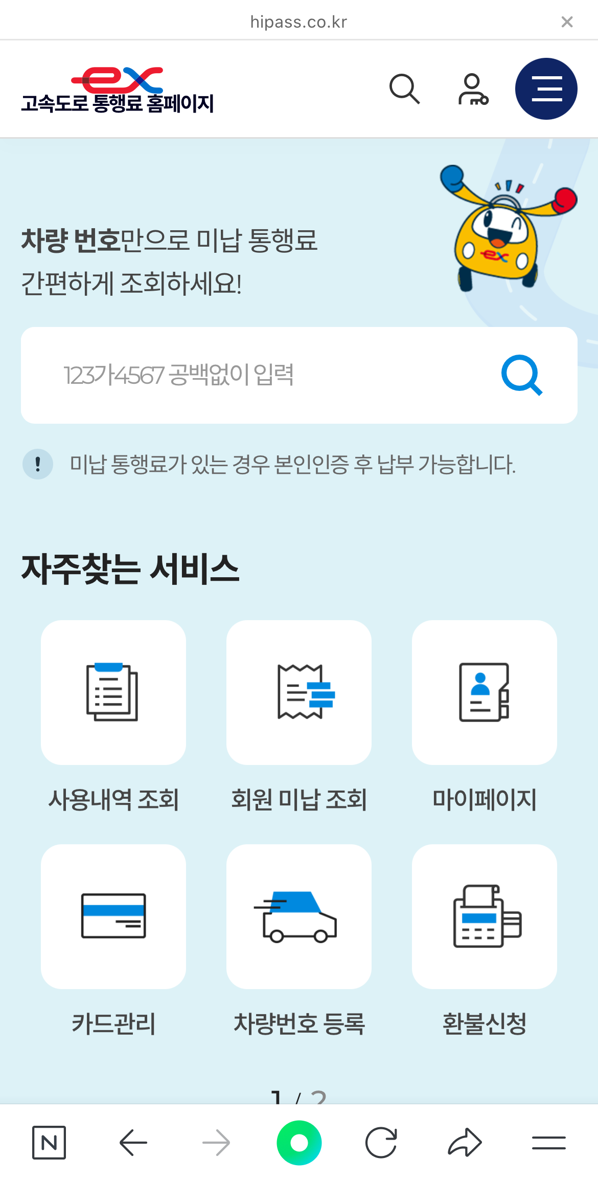 고속도로 하이패스 사용내역을 어플 없이 확인하는 방법도 가능하다. 검색창에 하이패스나 고속도로 통행료를 검색하면 고속도로 통행료 홈페이지라는 사이트가 나올 것이다. 여기에 들어가서 아까와 같은 방법으로 진행을 하면 된다. 본인인증 로그인을 하고 카드를 등록하면 하이패스 이용내역을 확인할 수 있다.