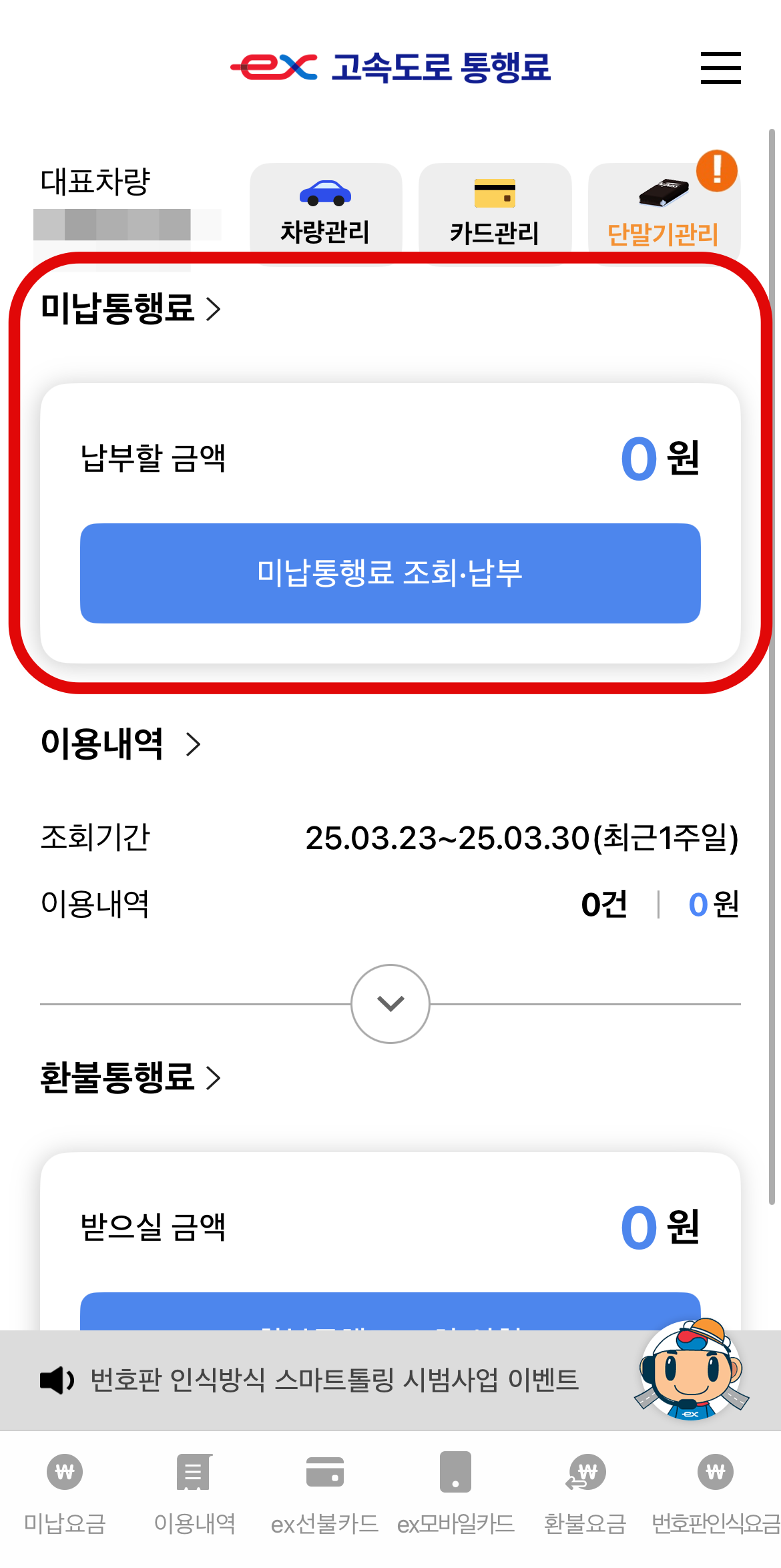 고속도로 통행료 어플에서 하이패스 사용내역 조회뿐만 아니라 미납통행료도 확인이 가능하다. 혹시 선불카드에 돈이 부족해서, 급해서, 깜빡하고 안 낸 고속도로 통행료가 있었다면 여기서 확인이 가능하고 납부까지 할 수 있다. 이제는 번호판으로 인식을 하여 통행료를 납부하는 방식이 생기고 있다고 하는데 성공적으로만 된다면 지금보다도 더 쉽고 빠르게 고속도로를 이용할 수 있을 것 같다.