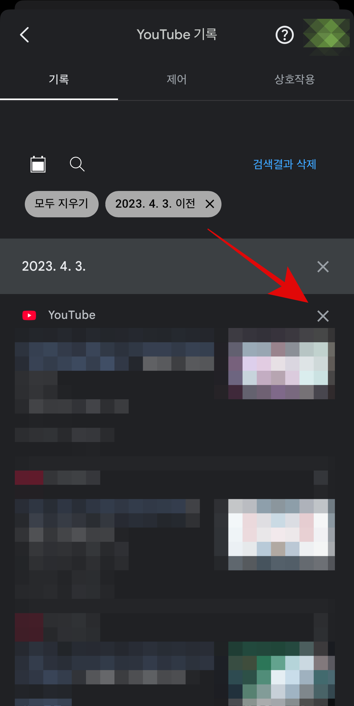 유튜브 시청기록 전체 삭제 말고 오래전에 본 시청기록 하나를 지우고 싶다면 이렇게 할 수 있다. 앞의 방법과 마찬가지로 내 페이지에서 오른쪽 위에 있는 점 3개 버튼을 누른다. 그리고 시청 기록 삭제가 아닌 가장 아래에 있는 전체 기록 관리로 들어가자. 그러고 나서 달력모양을 눌러 그 영상을 시청한 날짜를 입력한다. 유튜브 시청기록 삭제를 하고 싶은 영상 오른쪽에 있는 x를 누르면 시청기록에서 삭제할 수 있다.