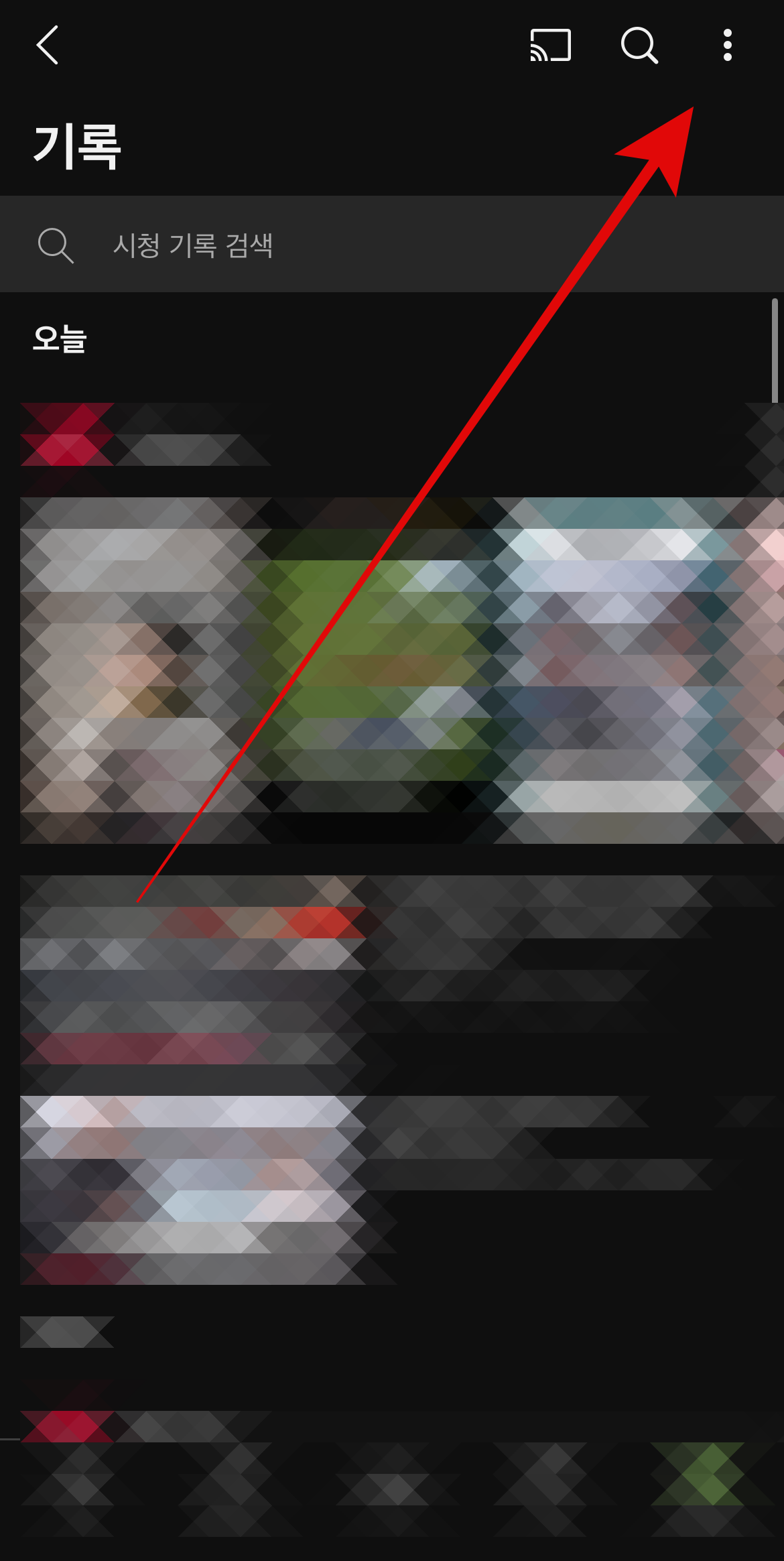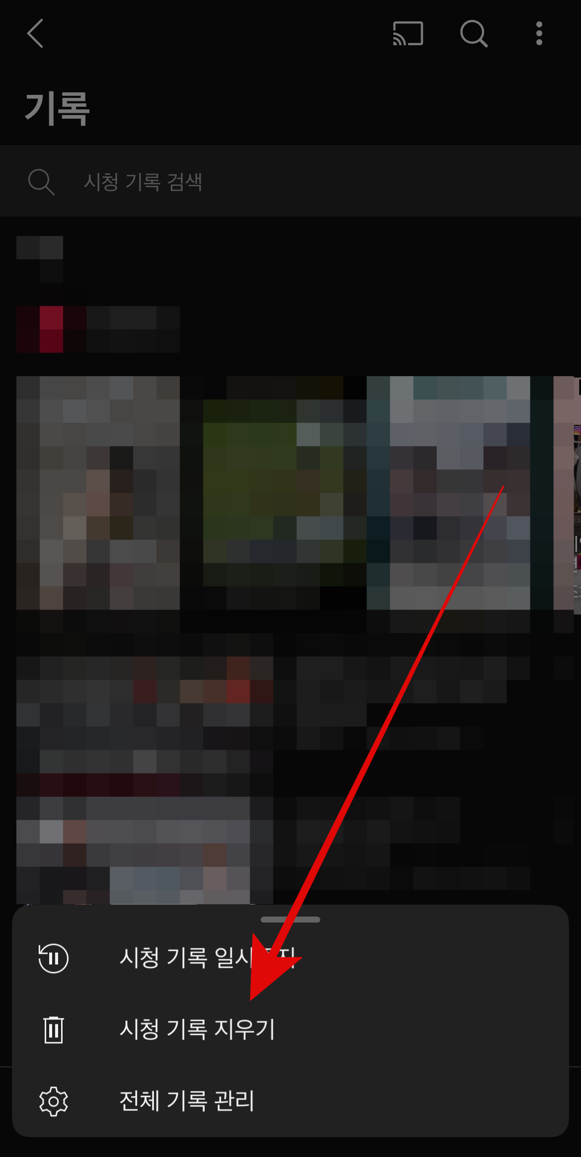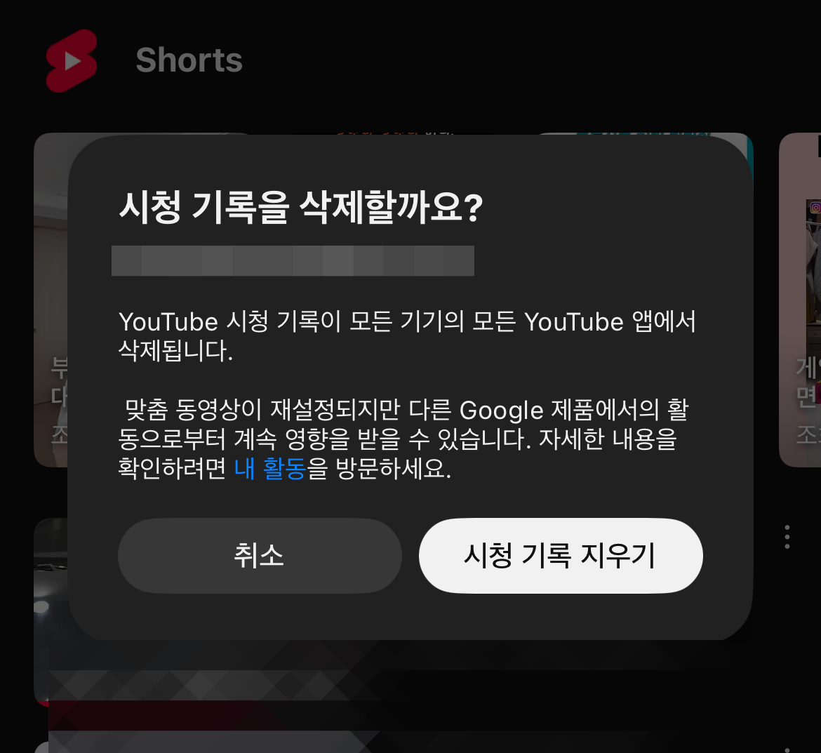 하나의 시청 기록이 아닌 전체 유튜브 시청기록 삭제를 원한다면 동영상 오른쪽 위의 점 3개 버튼이 아니라 내 페이지에서 가장 오른쪽 위에 있는 점 3개 버튼을 눌러보자. 그리고 두 번째에 나오는 시청 기록 지우기를 누르면 이때까지 시청했던 모든 기록들이 삭제된다. 유튜브 알고리즘이 나랑 맞지 않다면 이 방법을 통하여 초기화를 할 수 있다.