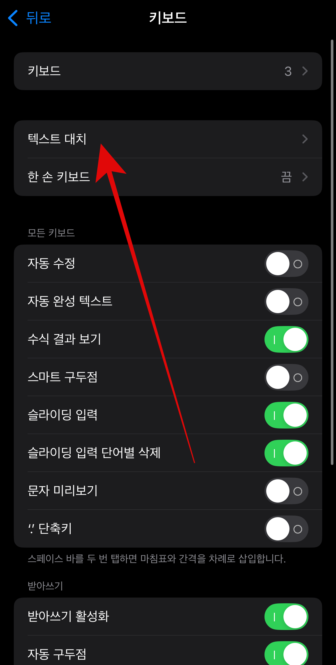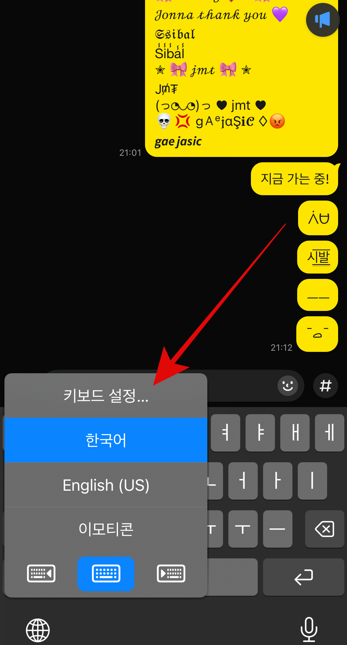 키보드를 열었을 때 한/영 전환키(지구본)를 꾹 눌러보자. 그러면 한/영 변환키와 이모티콘과 함께 가장 위에 키보드 설정이 나올 것이다. 이렇게 키보드 설정에 들어가서 텍스트 대치로 들어가면 더욱 빠르게 아이폰 텍스트 대치 설정이 가능하다.