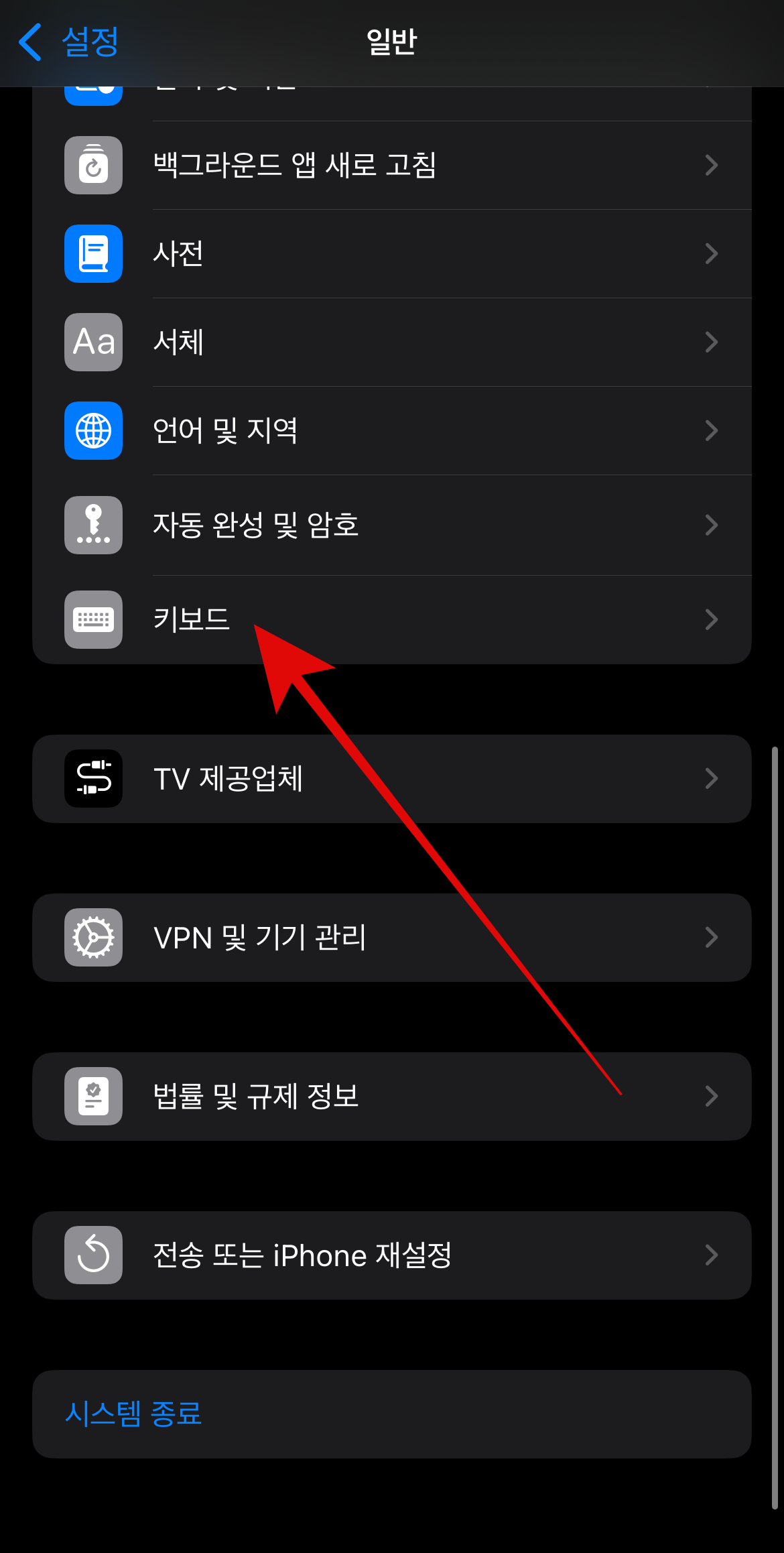 아이폰 텍스트 대치를 설정하기 위해서는 키보드 설정으로 들어가야 한다. 설정에서 일반-키보드로 들어가자. 그러면 두 번째에 텍스트 대치라는 설정을 볼 수 있다. 이렇게 들어가도 되지만 더 빠르게 들어가는 방법도 있다.