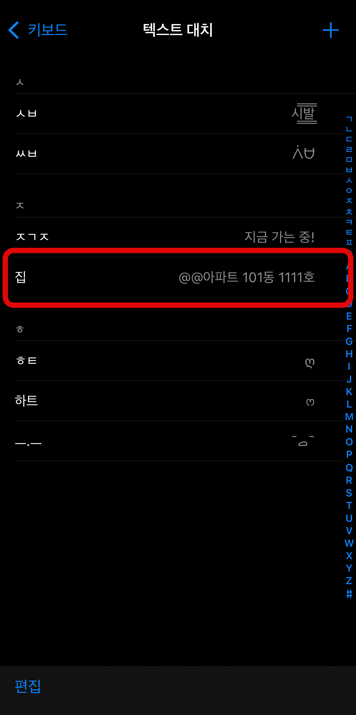 아까는 없었던 집이 추가된 것을 볼 수 있다. 이렇게 되면 아이폰 텍스트 대치 설정이 잘 된 것이다. 그리고 메모장이나 카톡으로 가서 집을 입력해 보면 자동으로 내가 설정한 상세한 주소가 나오는 것을 볼 수 있을 것이다. 이런 식으로 자주 사용하는 문구나 입력하기 어려운 이모티콘, 특수문자들을 설정을 해 놓고 사용하면 편리하게 사용할 수 있을 것이다.