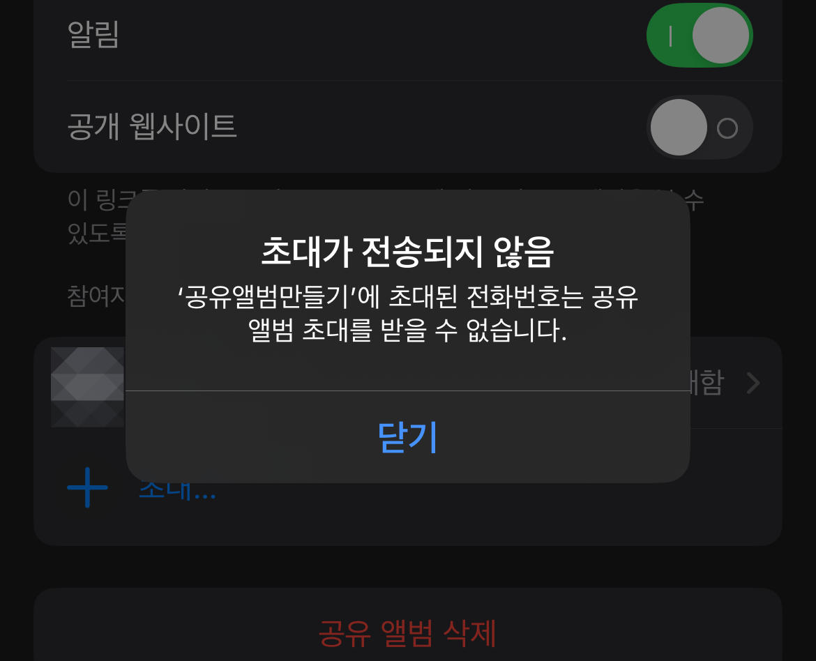 아이폰 공유앨범 기능은 아이폰 사용자끼리만 가능하다. 그렇기 때문에 아이폰 공유앨범 초대를 보낸 경우 위와 같이 초대가 전송되지 않았다고 뜨며 실패했다는 문구가 나올 것이다. 요즘 점점 아이폰을 사용하는 사람들이 많아지면서 더욱 유용하게 사용할 수 있는 기능이 되고 있다.