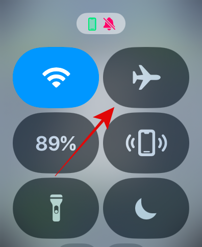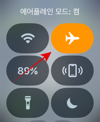 두 번째로 애플워치 무음모드할 수 있는 방법은 비행기 모드를 사용하는 것이다. 비행기를 탑승하거나 애플워치에서 아예 알림이나 진동 자체도 오지 않게 설정하는 방법이다. 아까와 같은 방법으로 제어센터를 열고 가장 위에 있는 비행기 모양을 누르면 쉽게 켰다 껐다 설정이 가능하다.