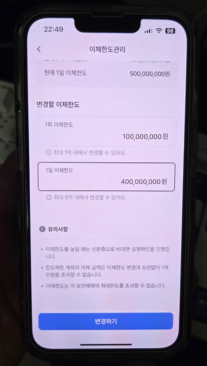 이체관리로 들어오면 이체에 대한 설정을 할 수 있는데 여기서 이체한도관리로 들어가자. 그리고 원하는 1회 이체한도와 1일 이체한도를 입력하고 변경하기를 누르면 된다. 이체한도를 낮출 때는 별다른 본인인증 없이 간단하게 바로 이체한도를 변경할 수 있다. 하지만 우리은행 이체한도 늘리기 위해서는 몇 가지의 본인인증을 거쳐야 한다.