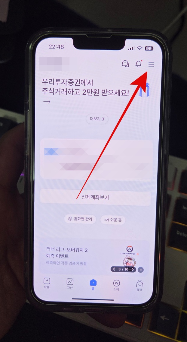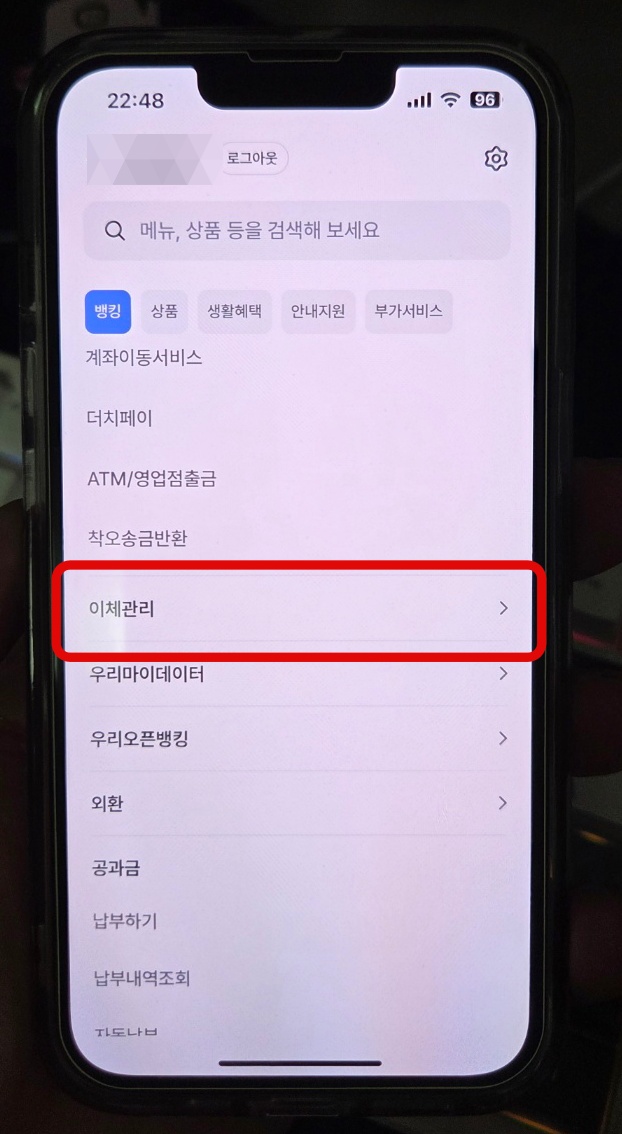 우리은행 이체한도 늘리기 위해서 우리은행 어플을 다운로드해야 한다. 다른 은행을 사용한다면 그 은행의 어플을 다운로드해서 들어가자. 은행어플에 들어가서 오른쪽 위에 있는 선 3개 버튼(점 3개)을 누른다. 이 버튼이 은행 어플의 모든 설정을 할 수 있는 버튼이다. 여기서 스크롤을 쭉 내리다 보면 이체관리라는 카테고리가 보일 것이다. 이체관리를 눌러 들어간다.