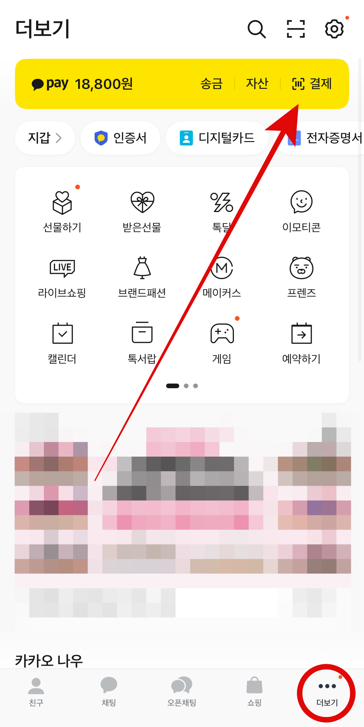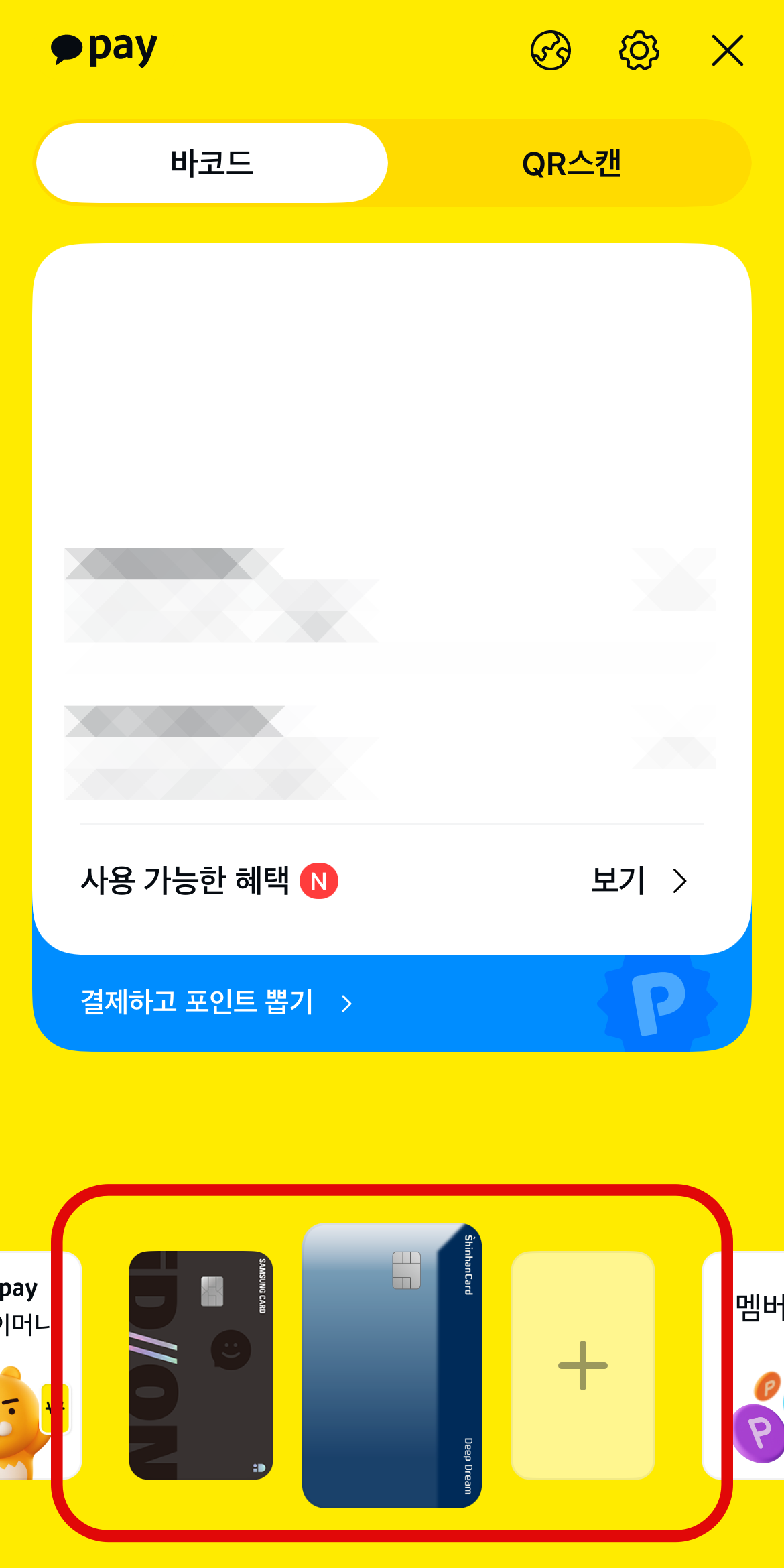 카카오페이 바코드를 생성하는 방법은 매우 간단하다. 카카오톡에 들어가서 오른쪽 아래에 있는 더 보기를 눌러 들어가 오른쪽에 있는 결제를 눌러보자. 그러면 빨간 네모 안에 바코드와 QR코드가 생성된 것을 볼 수 있을 것이다. 그 바코드를 아까 맥도날드 키오스크에 인식을 시키면 된다. 하단에 본인 카드를 추가해 놓으면 카카오페이 머니에서 나가는 것이 아닌 카드결제로도 가능하니 참고하도록 하자.