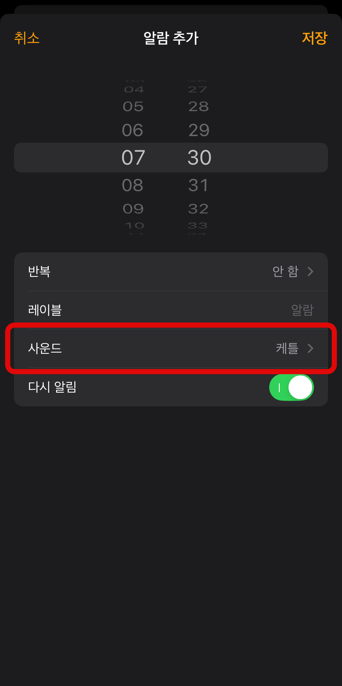 알람을 맞출 때 시간만 설정하고 바로 완료를 누르는 경우가 있는데 중간에 보이는 사운드로 들어가서 알람음이 설정되어 있는지 확인해야 한다. 혹시 없음으로 설정되어 있는 경우 알람 소리는 안 울리고 휴대폰만 밝아질 것이다. 아이폰 알람 오류 시 첫 번째로 확인을 해볼 사항이다.